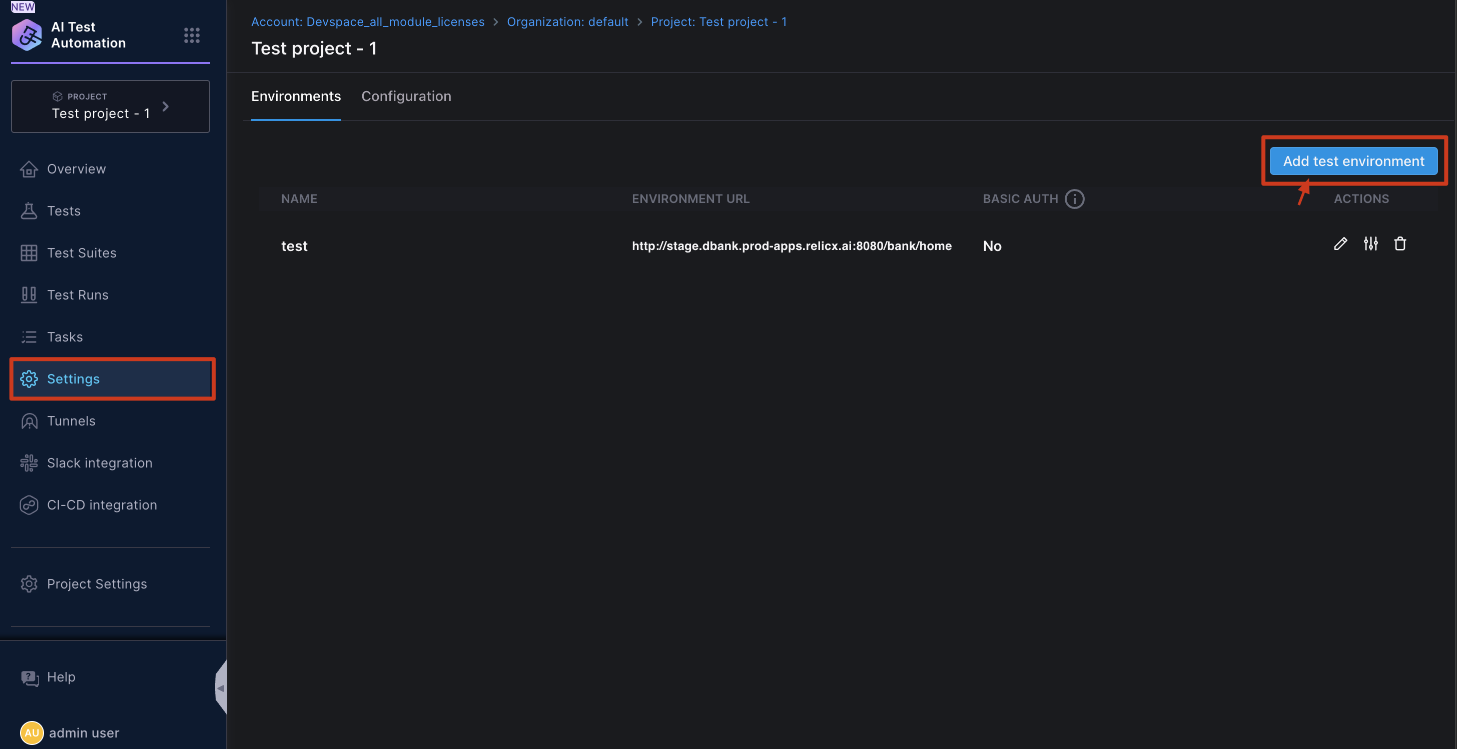 AI Test Automation users can add a Test environment during the onboarding flow but if you want to add another test environment you can add another one anytime. You can access the environment page from Settings --> Application Name --> Environments tab. Click on the Add Test Environment button to access the Test Environment screen,