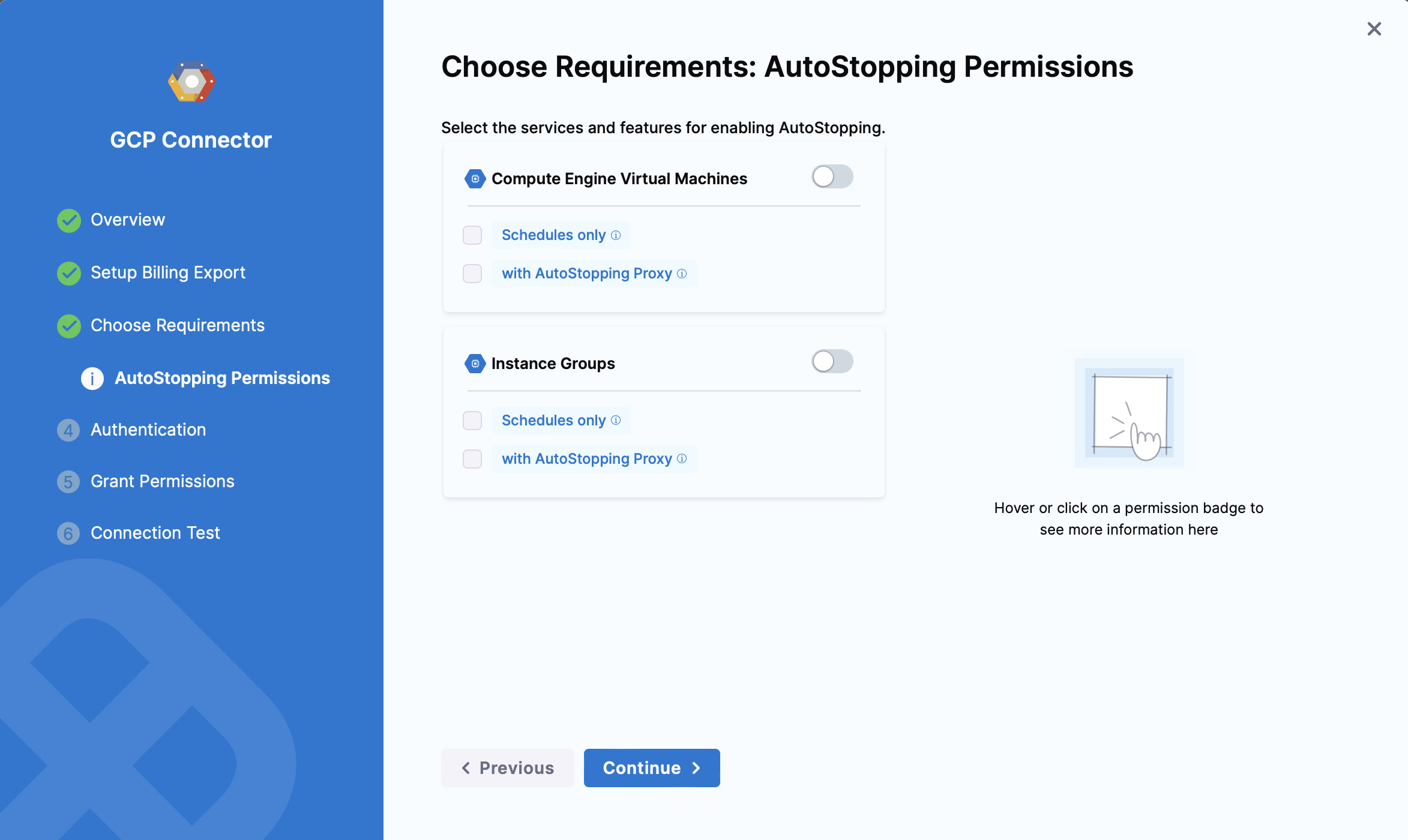 Optimization using AutoStopping rulesThis feature allows you to enable Intelligent Cloud AutoStopping for your GCP cloud resources. If selected, you can select granular permissions in the next step
