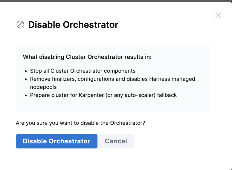 Once disabled, the orchestrator stops managing the selected cluster. No new orchestration actions are triggered, and existing policies are not enforced until you enable the orchestrator again.