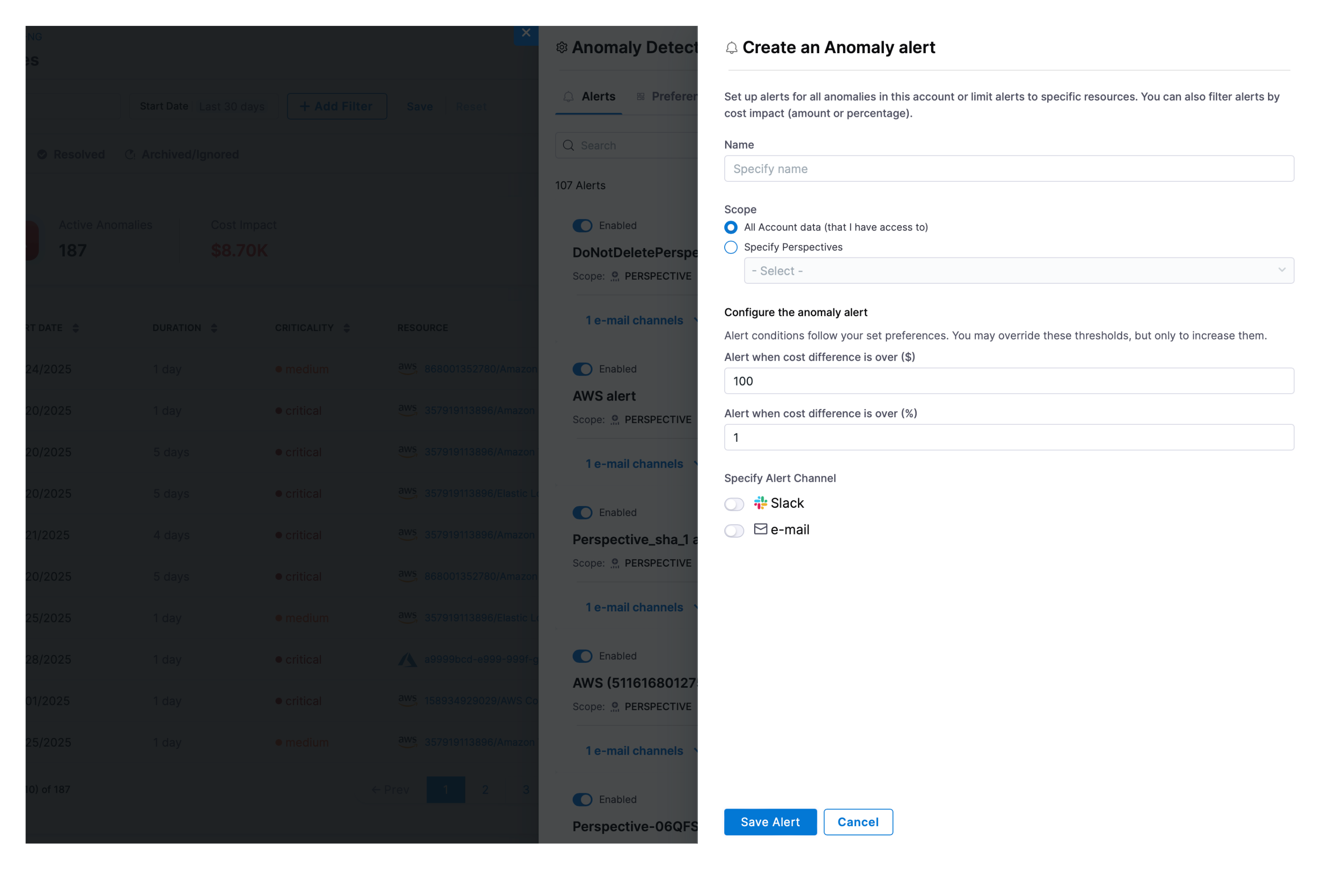 • Scope: Select all account data or specific perspectives for anomaly alerts.