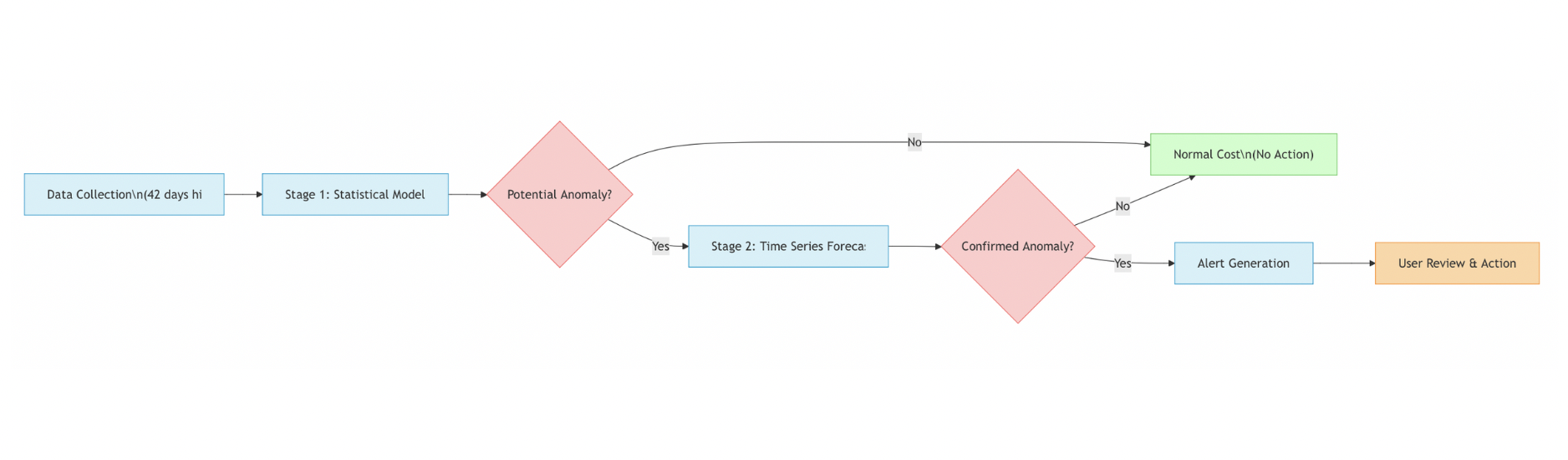 • Stage 1: Statistical Analysis Model The first stage employs a statistical model that establishes a baseline by analyzing historical spending patterns. Using 42 days of data with the default Prophet model, it calculates key metrics like mean costs, standard deviations, and seasonal patterns. This creates a "normal spending corridor" based on these historical patterns, accounting for typical day-to-day and week-to-week fluctuations in your cloud costs.