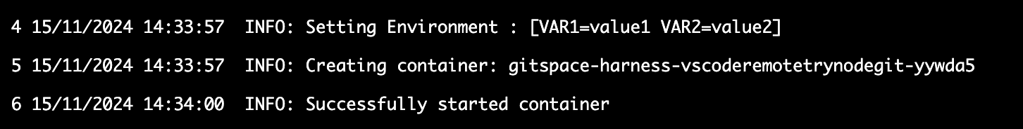 Once you’ve added the containerEnv property, you can verify the environment variable setup by checking the container logs while creating a Gitspace through the Harness UI.