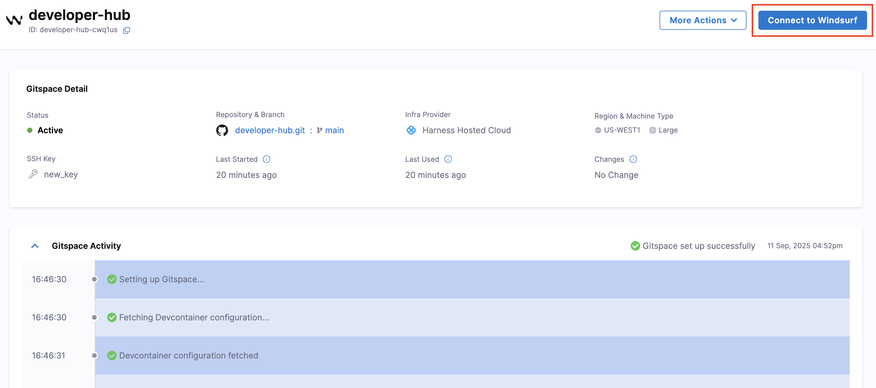 Once the setup completes, your Gitspace will be successfully connected to Windsurf IDE. Congratulations! You are now ready to work on your Gitspace directly within Windsurf.