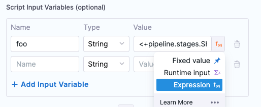 You can also use expressions in Value. For example, if you have an output variable from a previous Shell Script step, you can copy it from the executed step Outputs tab and use it in Value.