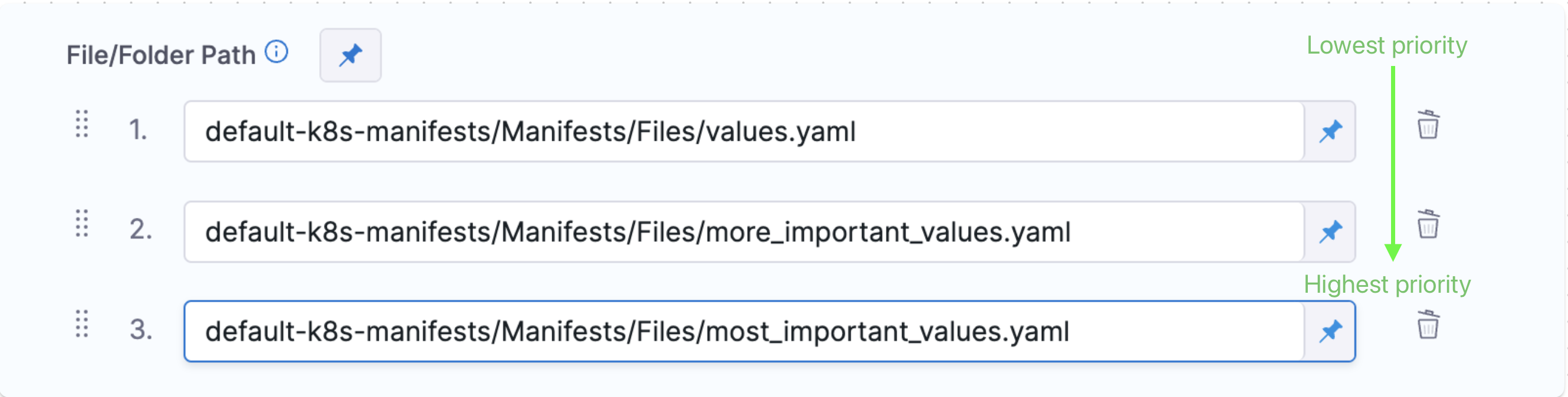 You can enter multiple values file paths by clicking Add File. At runtime, Harness will compile the files into one values file.