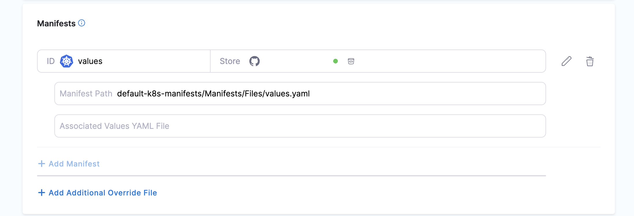 • Different repos: If the Values YAML are in a repo separate from your Kubernetes manifests or Helm Charts, or you just want to add them separately, you can them by selecting the Values YAML manifest type.