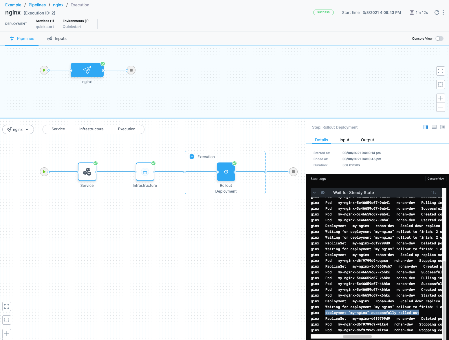Toggle Console View to watch the deployment with more detailed logging. Select the Rollout Deployment step and expand Wait for Steady State.