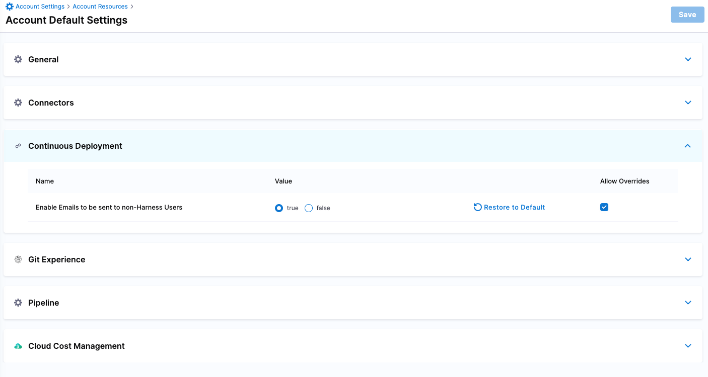 - In Default Settings (at the account, organization, or project level), select Continuous Deployment, and then set Enable Emails to be sent to non-Harness Users to true.