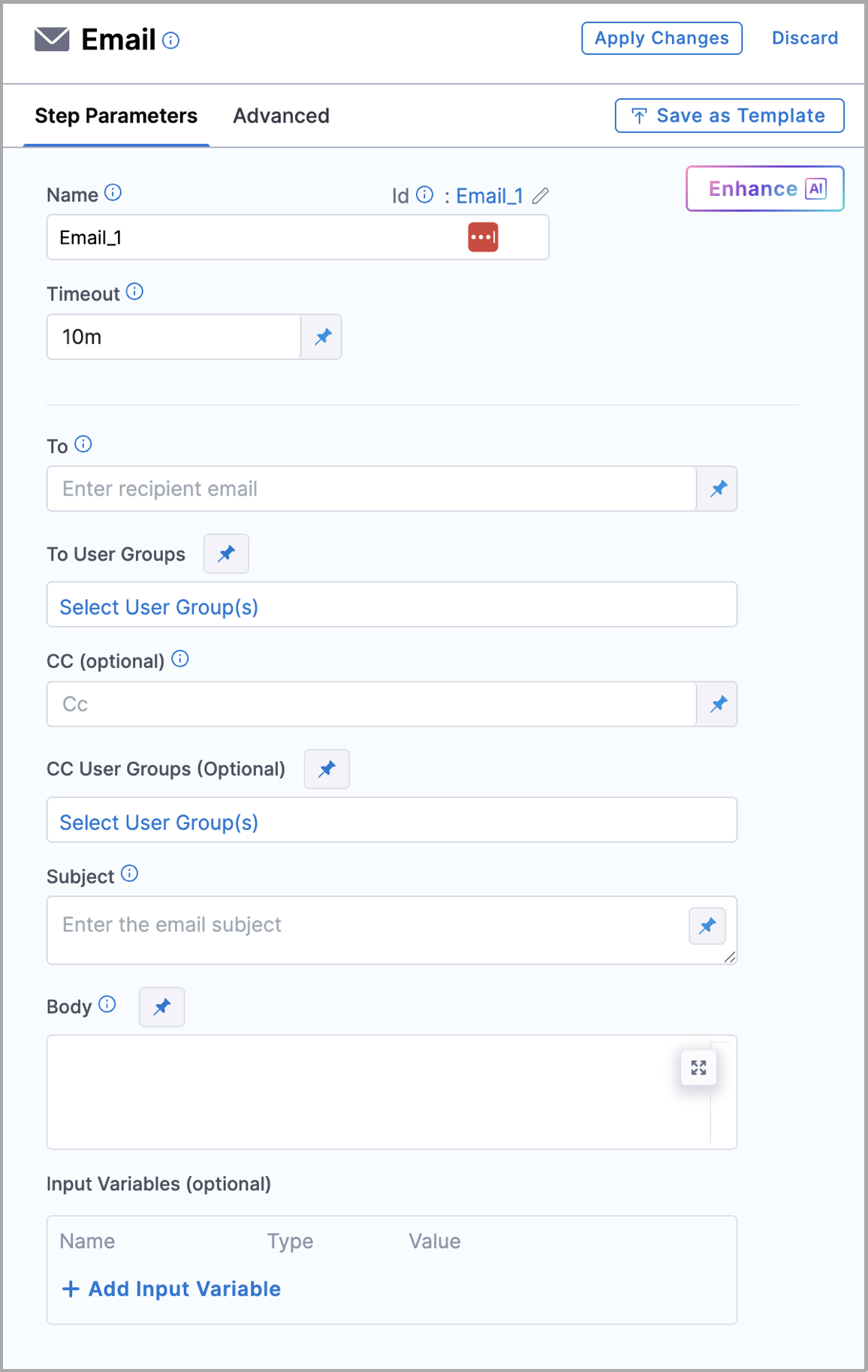 - Use input variables in the email step to customize the subject, body, and recipient list dynamically based on pipeline variables and context.