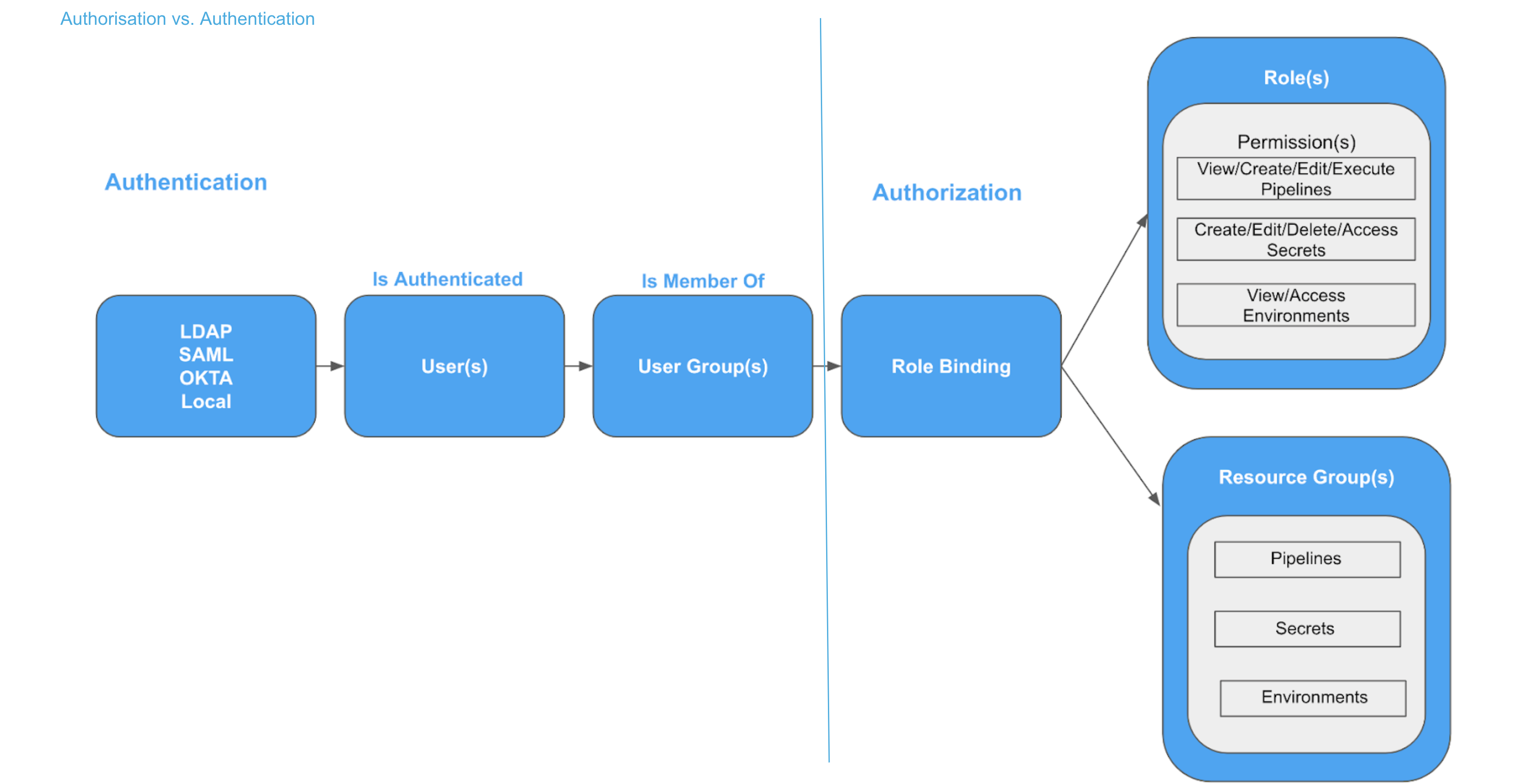 A representation of Harness RBAC, showing user authentication through user settings and authorization through user groups and role binding.