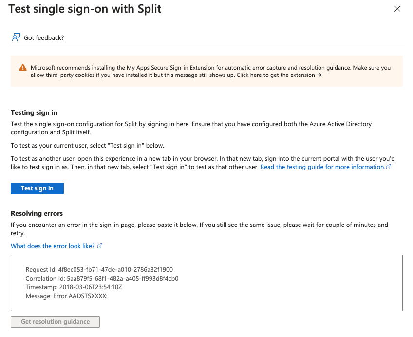If you have JIT enabled or if your Azure account’s email address already exists in your Split organization, click Test in Test single sign-on with Split.