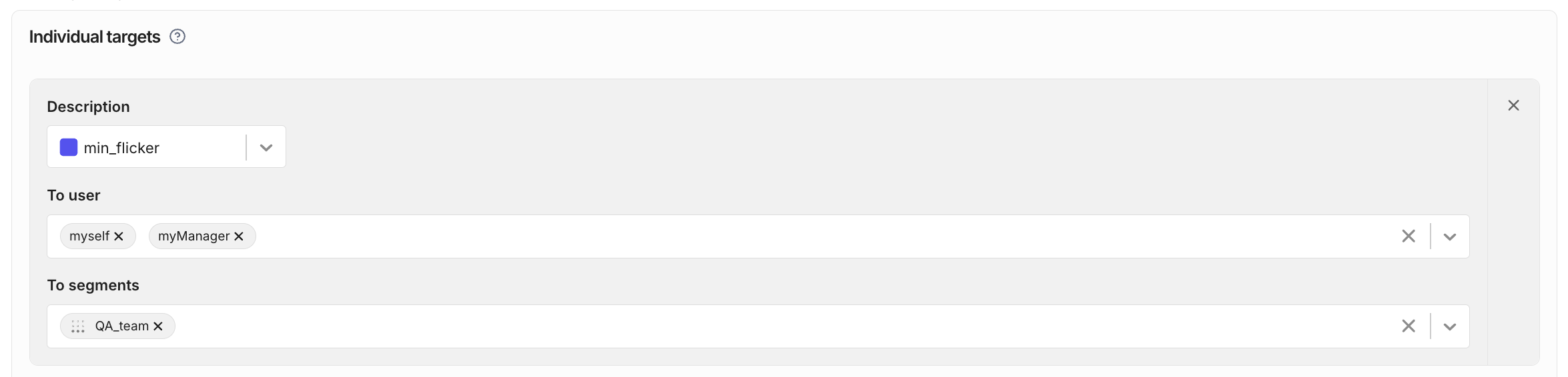 Click the Add new individual target button to assign a selected treatment to individual users or segments (e.g., a QA team, internal team, or a limited beta), as shown below.