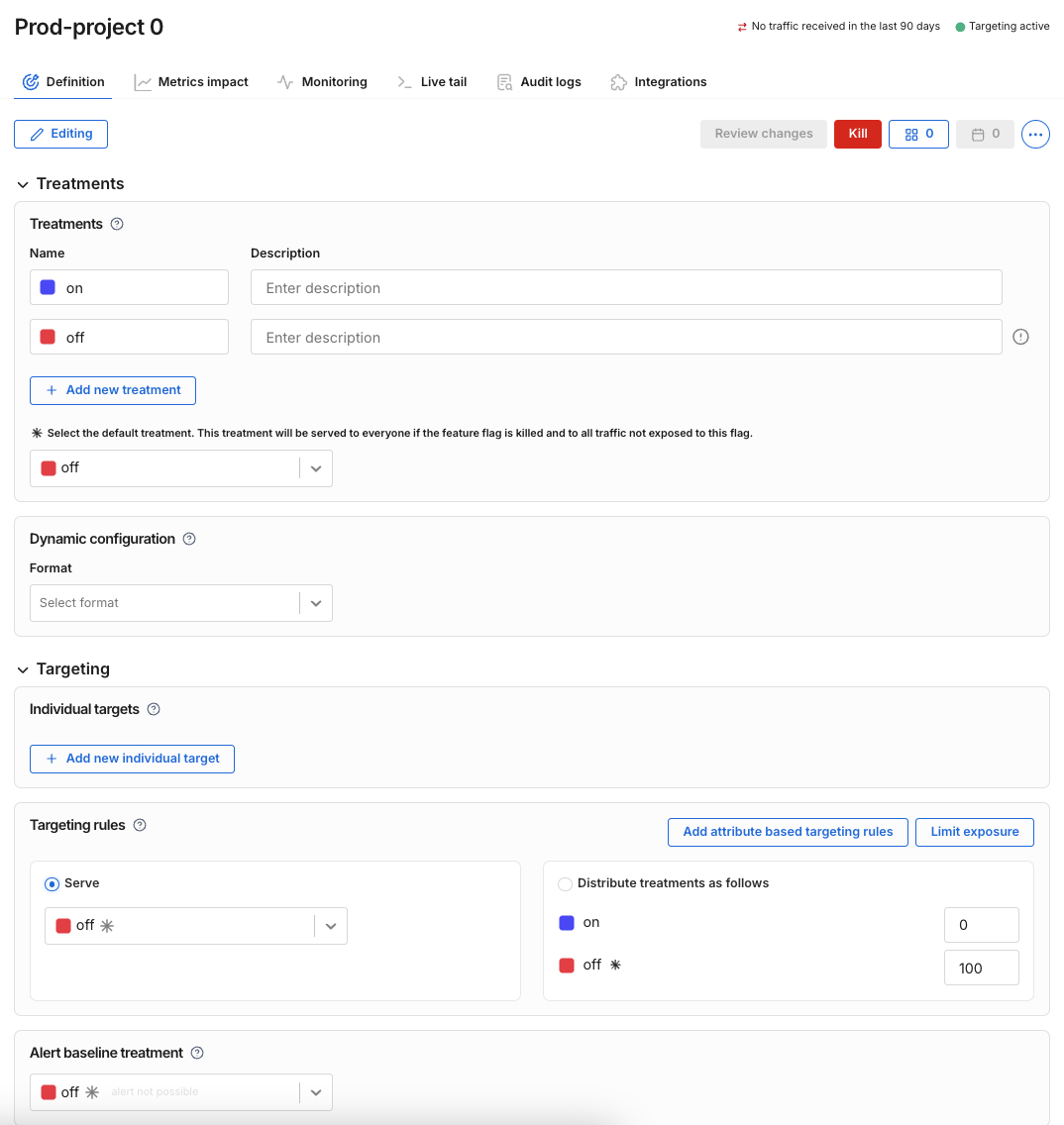 Initiating your feature flag definition for a given environment will create an initial set of treatments and a targeting rule that you can modify.