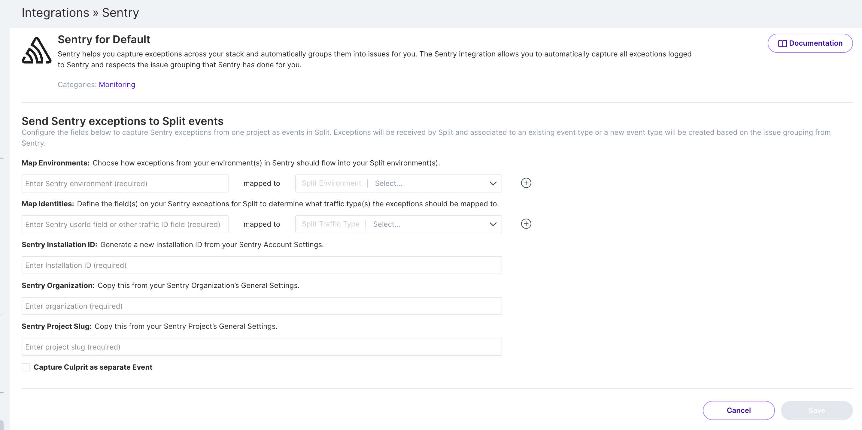 • Capture Culprit as separate Event. If you have have specific Sentry Issues that come up consistently and want to be able to create metrics based on a specifc Sentry Issue - select this checkbox to capture an extra event for each exception sent from Sentry.