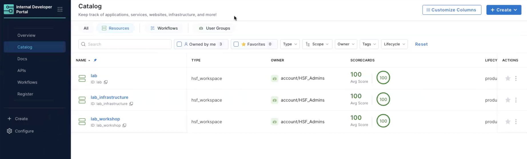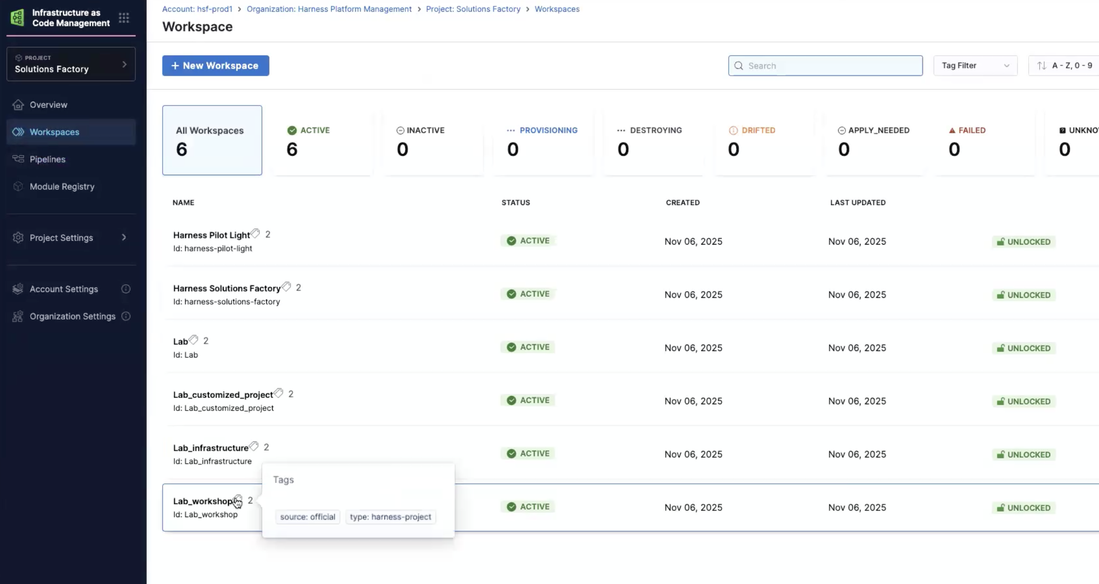 • Below are the resoures that are now currently in the account - one organization named Lab and two projects named infrastructure and workshop both in the Lab organization.
