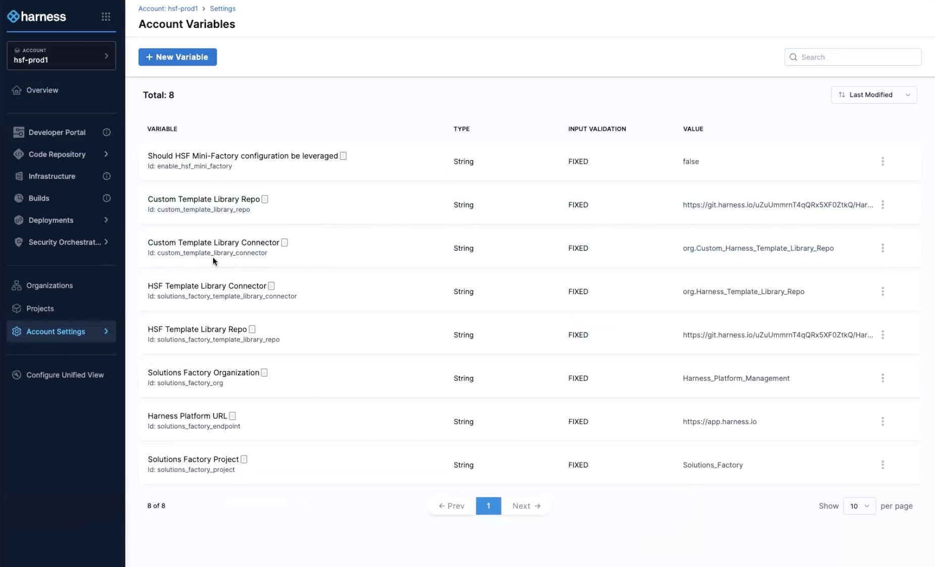 3. In the Harness Console go into Account Settings → Variables → Find and copy the Ids for Custom Template Library Repo and Custom Template Library Connector