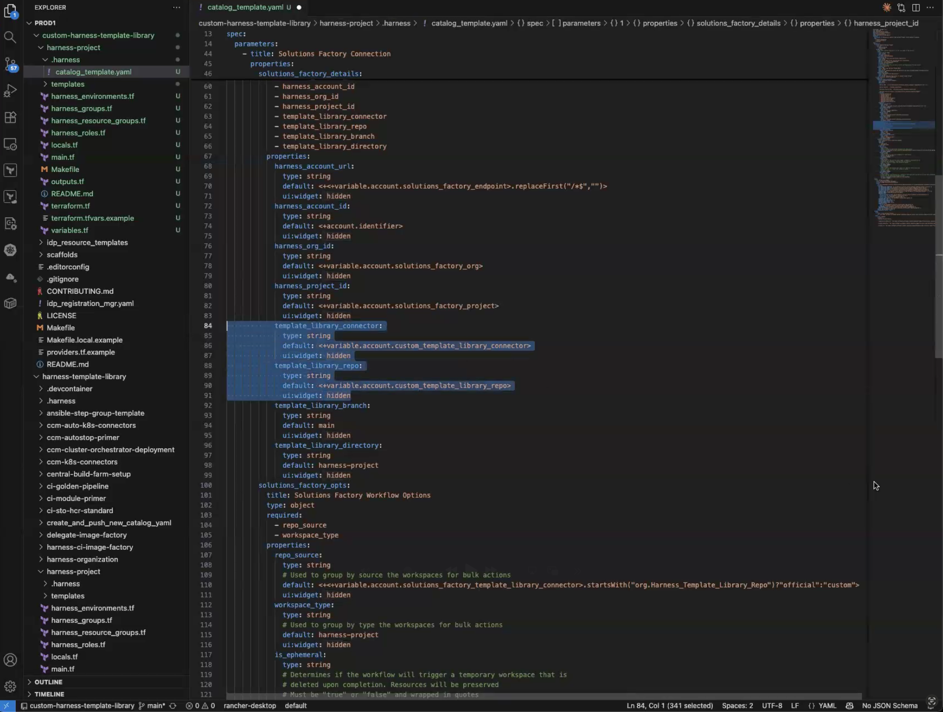 4. In custom-harness-template-library/harness-project/.harness go into catalog_template.yaml and find the properties template_library_connector and template_library_repo and paste in the Ids from above after “variable.account.” It should look like this: