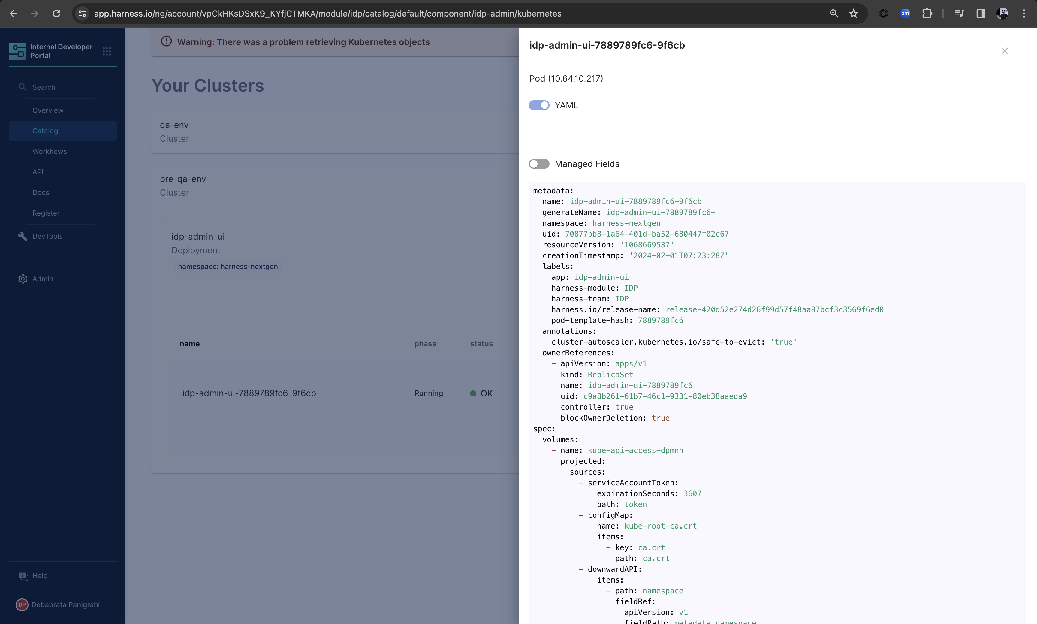 In order for IDP to detect that an entity has Kubernetes components, the following annotation should be added to the entity's catalog-info.yaml: