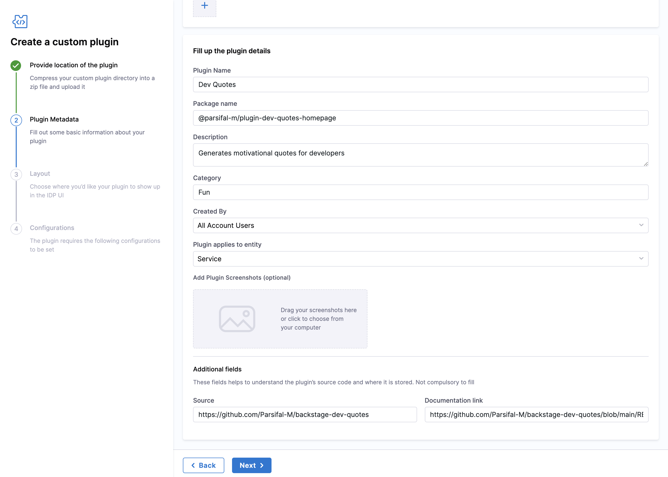 1. Now Click Next and start adding the Plugin Metadata. You have to fill the following fields