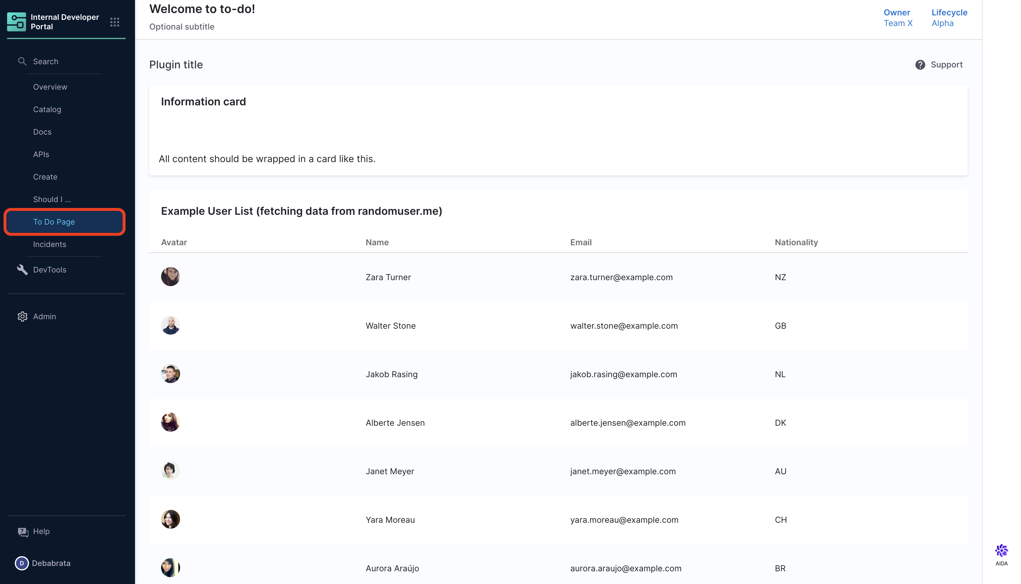 • For Full Page Plugin Under the Sidenav configuration, add the plugin name as a SidebarItem with reference to your plugin to: component name under props. Read more about [Configuring Layout of IDP Catalog pages](Configuring Layout of IDP Catalog pages).