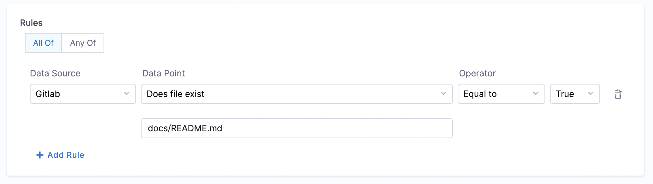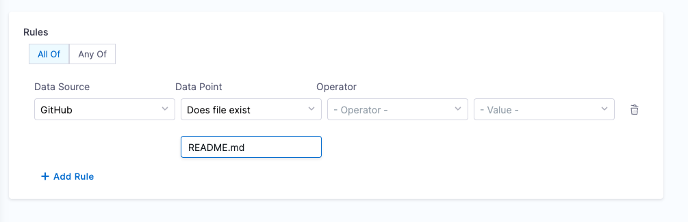 Calculation Method: Uses the backstage.io/source-location annotation to locate the repository and check for the file's presence. Make sure to mention the filename with extension or relative path from the root folder (e.g., README.md or docs/README.md) in the conditional input field.