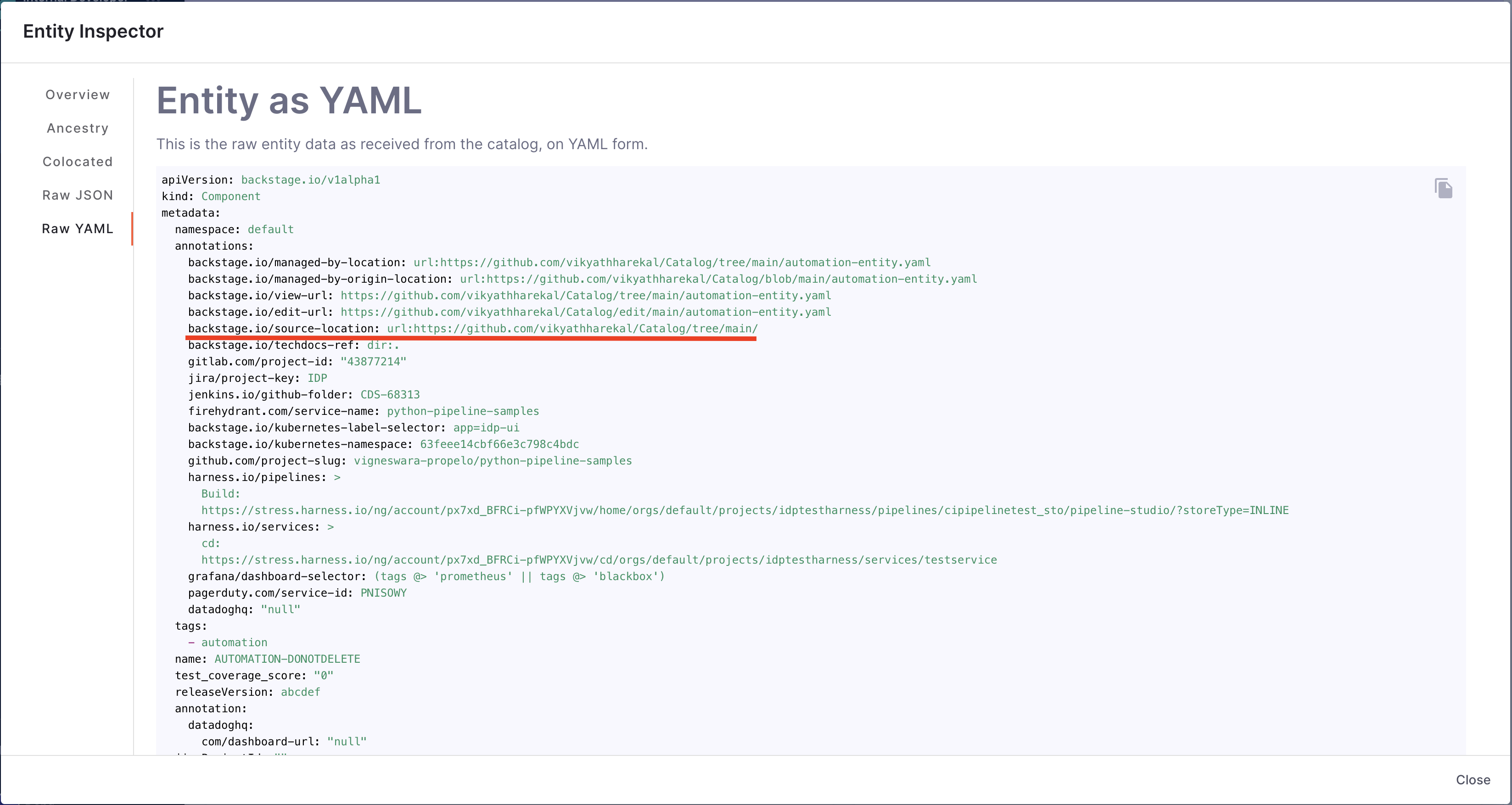 • Provide suitable backstage.io/source-location annotation if the catalog YAML file is present outside the source GitHub repository