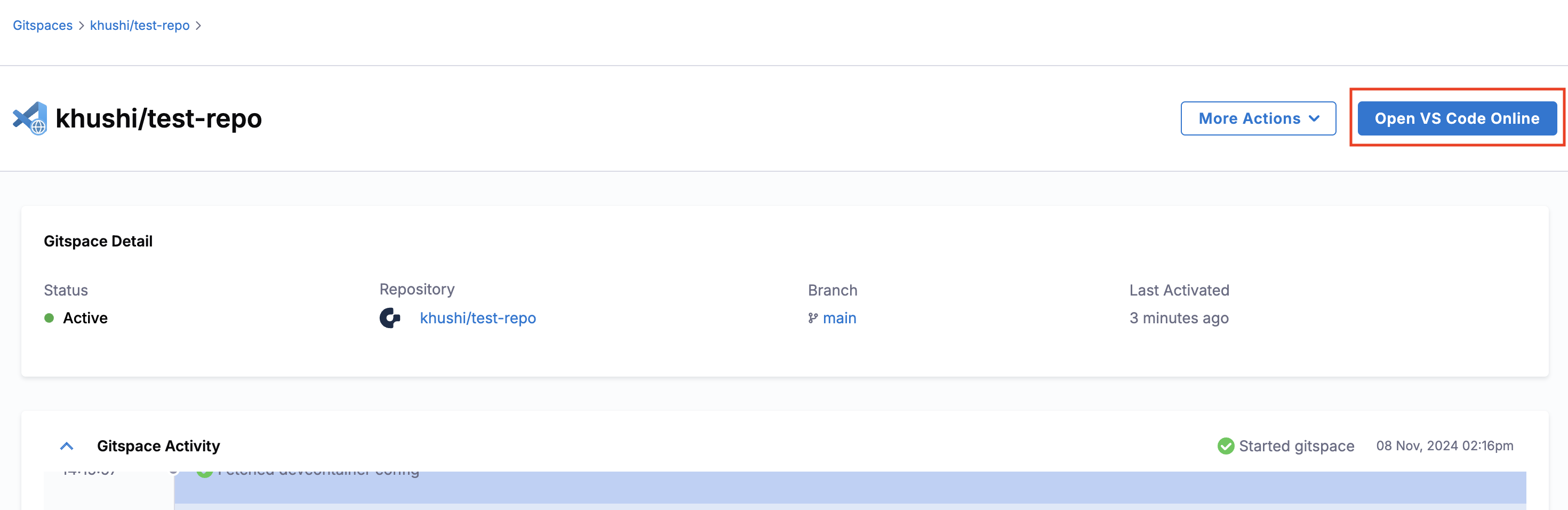 2. After the Gitspace is created, click “Open VS Code Onliner” from the Harness Open Source UI.