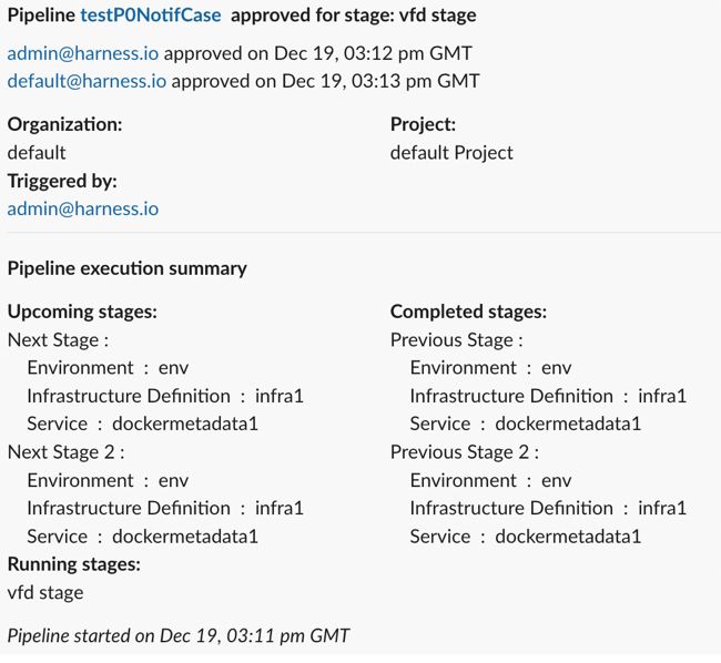 - Execution metadata like service, environment, and infrastructure identifiers are present for CD stages in approval notifications.