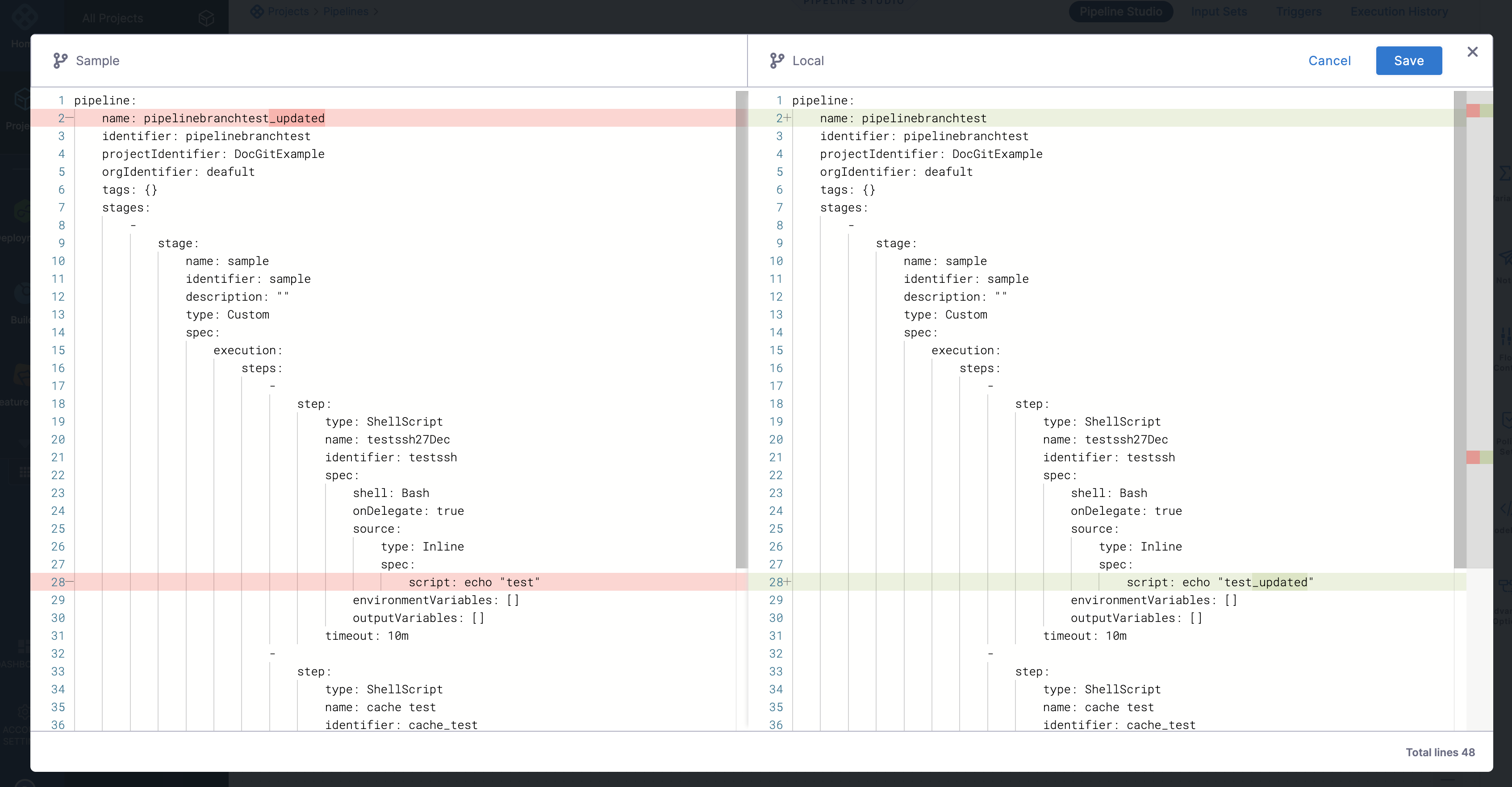 • Cancel: Retain changes made to the UI. There are no commits pushed to Git.