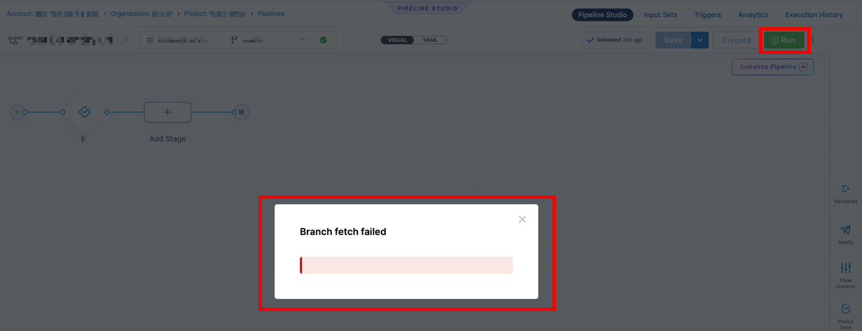 For existing entities, if the connectivity is broken, the pipeline will continue running and reference the last cache version of the entities during execution. This includes any remote entities that were kept in the remote repo. Harness maintains a cache with an expiration, and as long as the cache hasn't expired, users will see a Branch Fetch Failed error, but will still be able to execute the pipeline.