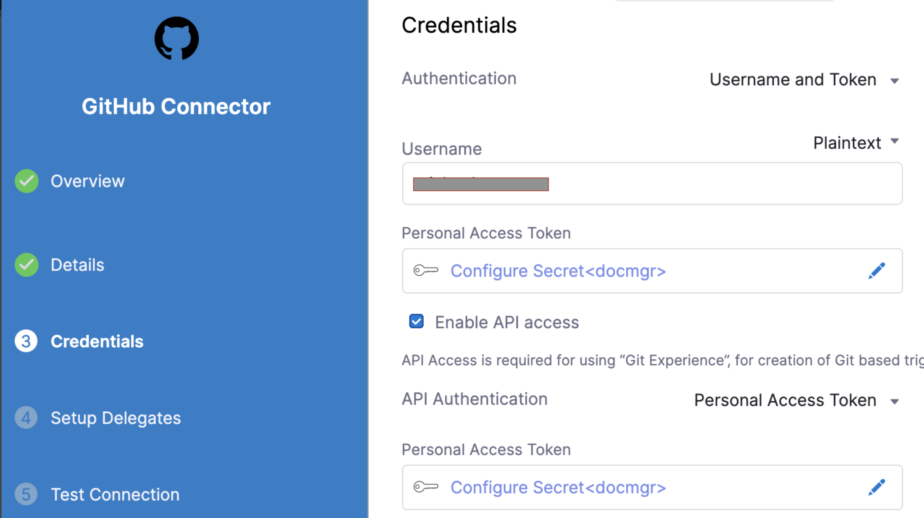 Connector must use the Enable API access option and Token The Connector must use the Enable API access option and Username and Token authentication. Harness requires the token for API access. Generate the token in your account on the Git provider and add it to Harness as a Secret. Next, use the token in the credentials for the Git Connector.​