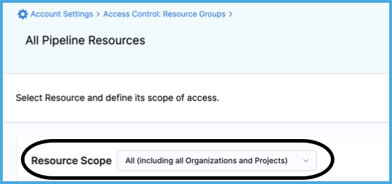 • All Resources Including Child Scopes: Includes all resources within the account's scope, as well as those within the scope of orgs and projects under the account. This is the most inclusive resource group possible.
