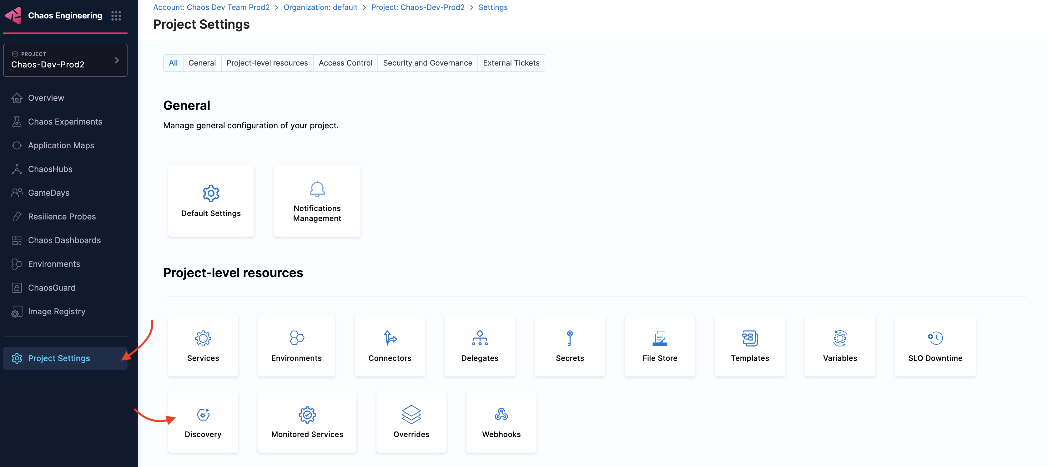 1. Navigate to Project Settings and select Discovery.