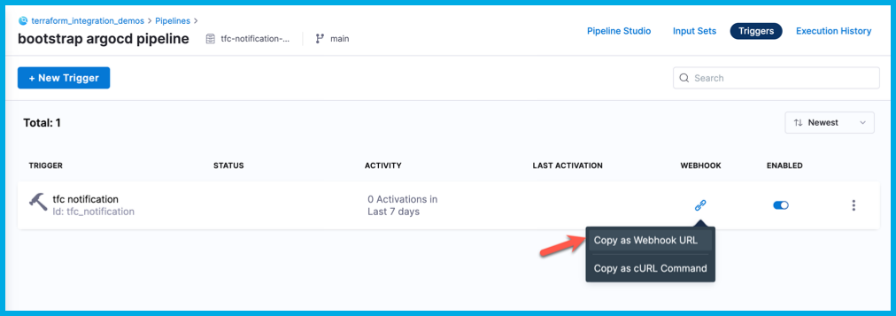 On the list of triggers, select the icon in the Webhook column, and then select Copy as Webhook URL. This value is referred to as