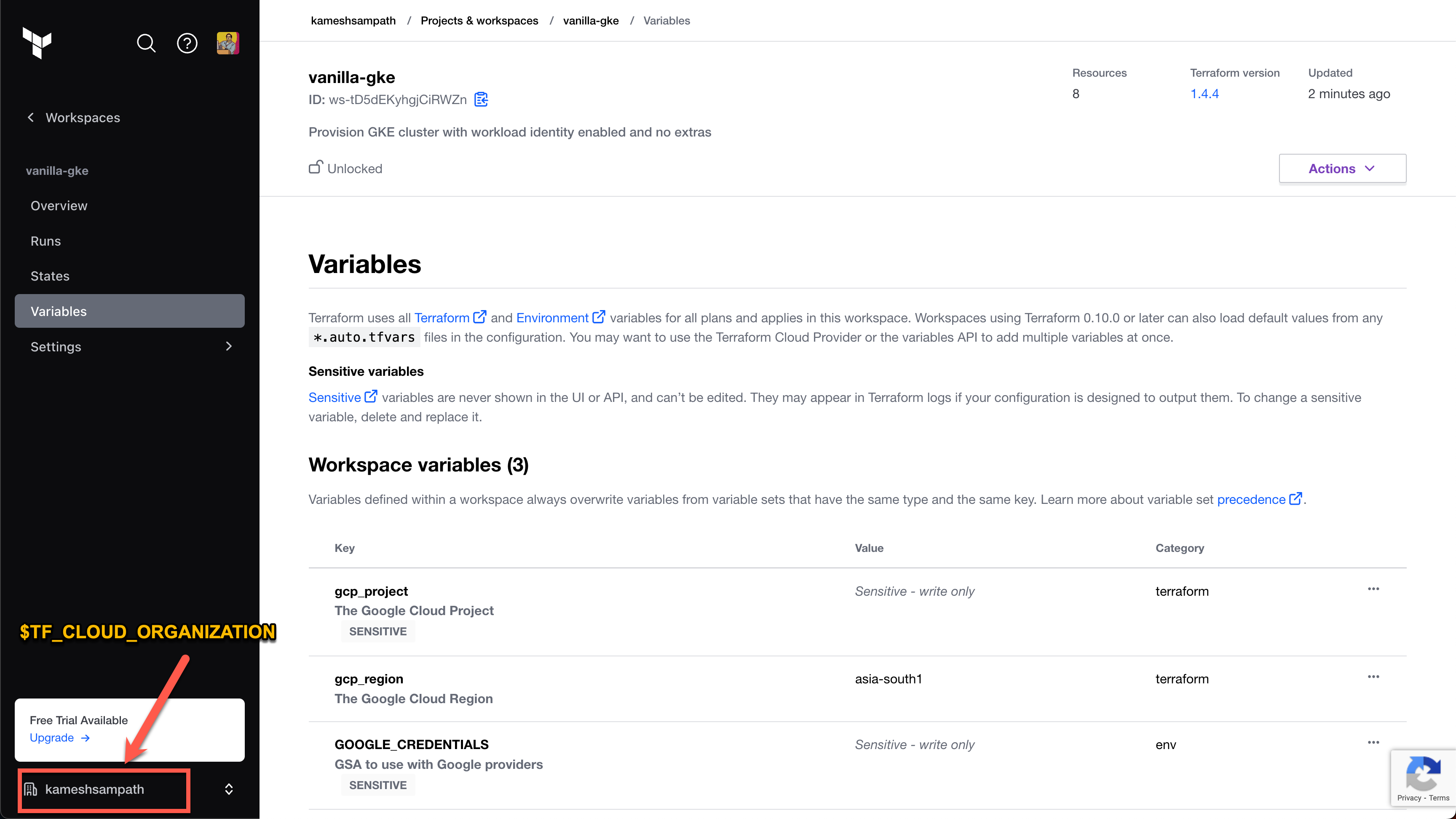 $TF_WORKSPACEand set the value to the name of your Terraform Cloud organization.