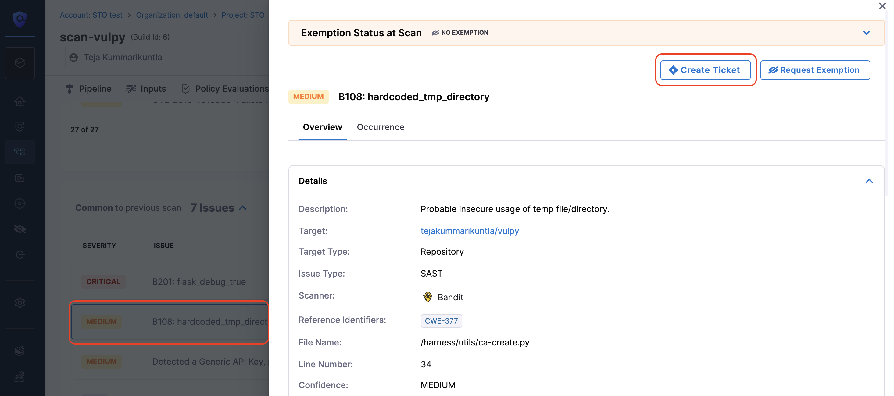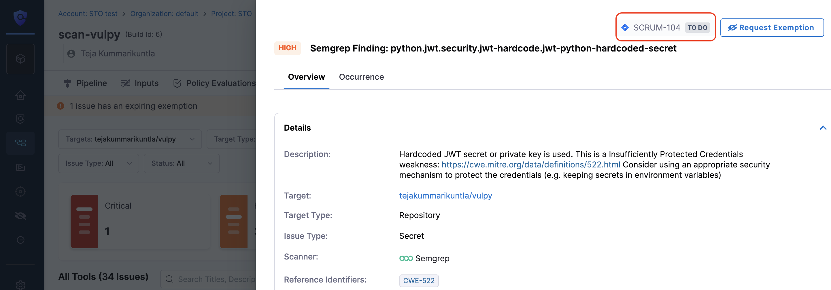 To create a Jira ticket from a security issue detected in STO scan results, follow the steps below.