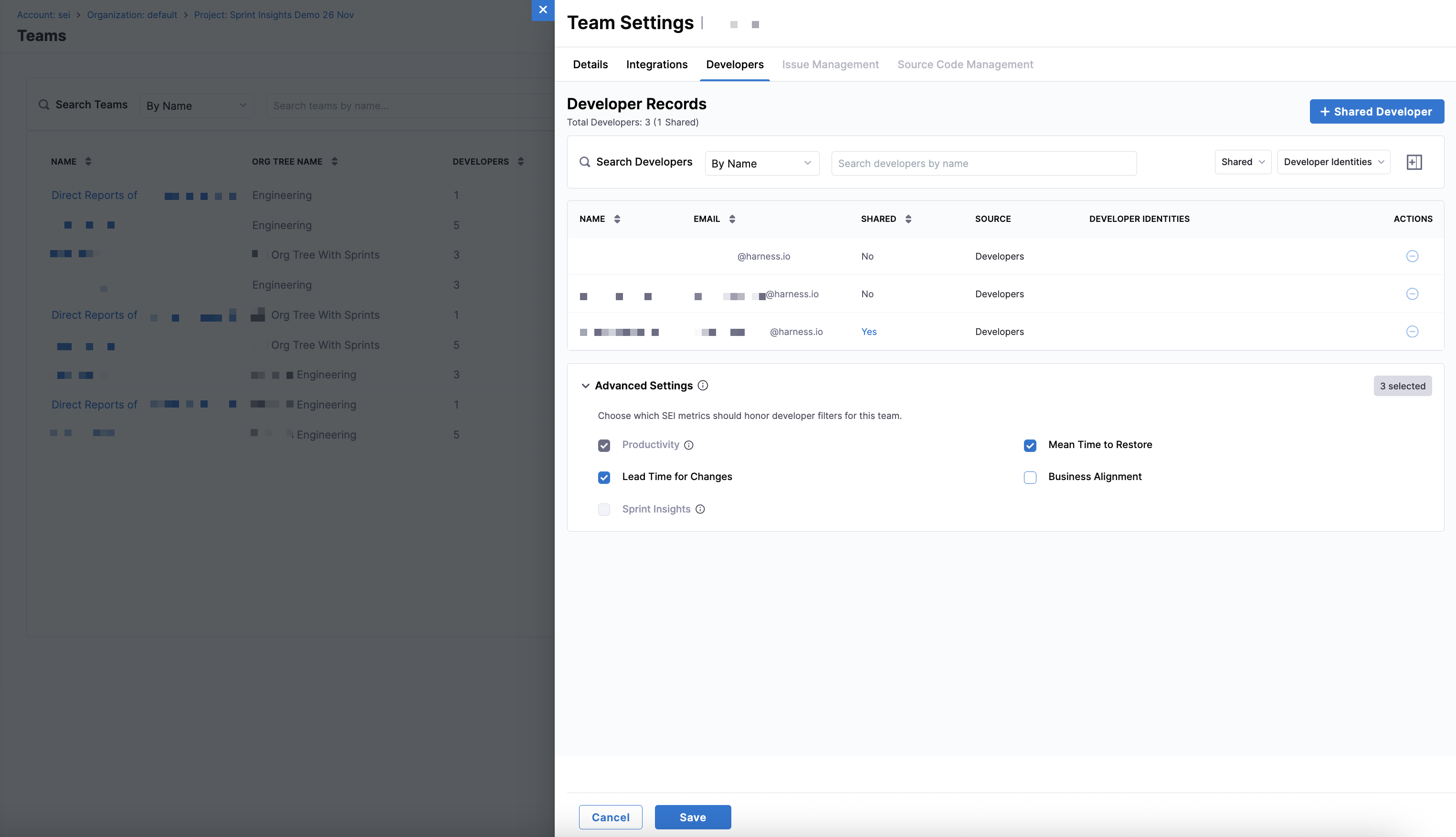 The Advanced Settings section on the Developers tab in Team Settings lets you control which Harness SEI metrics should honor developer filters for a team. This is useful when contributors such as managers or shared developers work across multiple teams but should only influence specific insights.