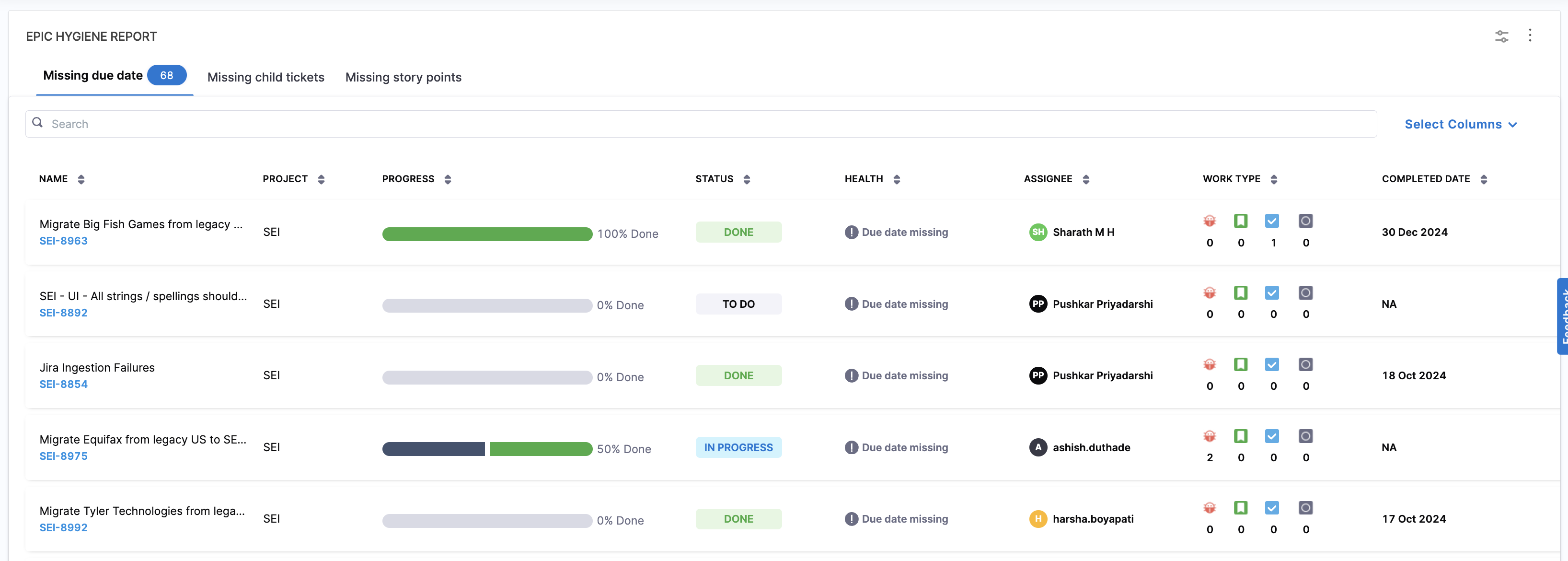 • Disorganized work: Epics without child tickets make it difficult to measure work breakdown.