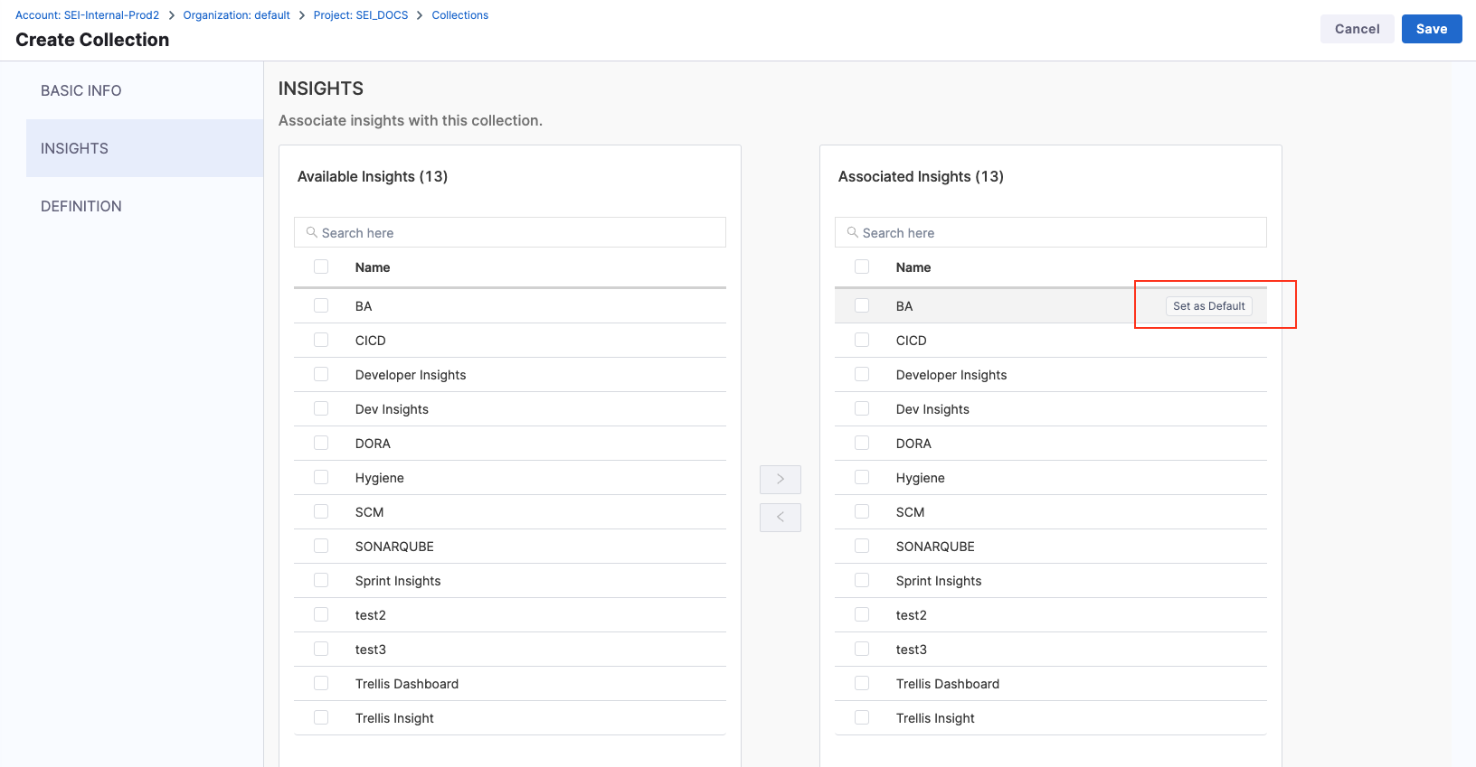 4. Select Set as Default to designate the default Insight for the Collection.