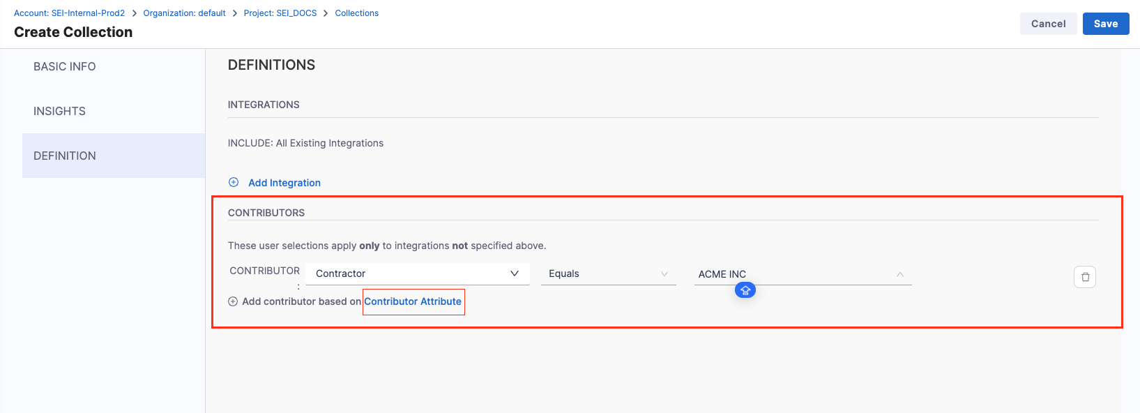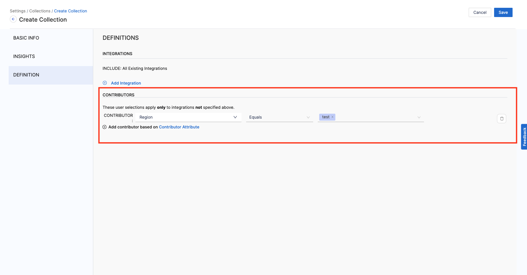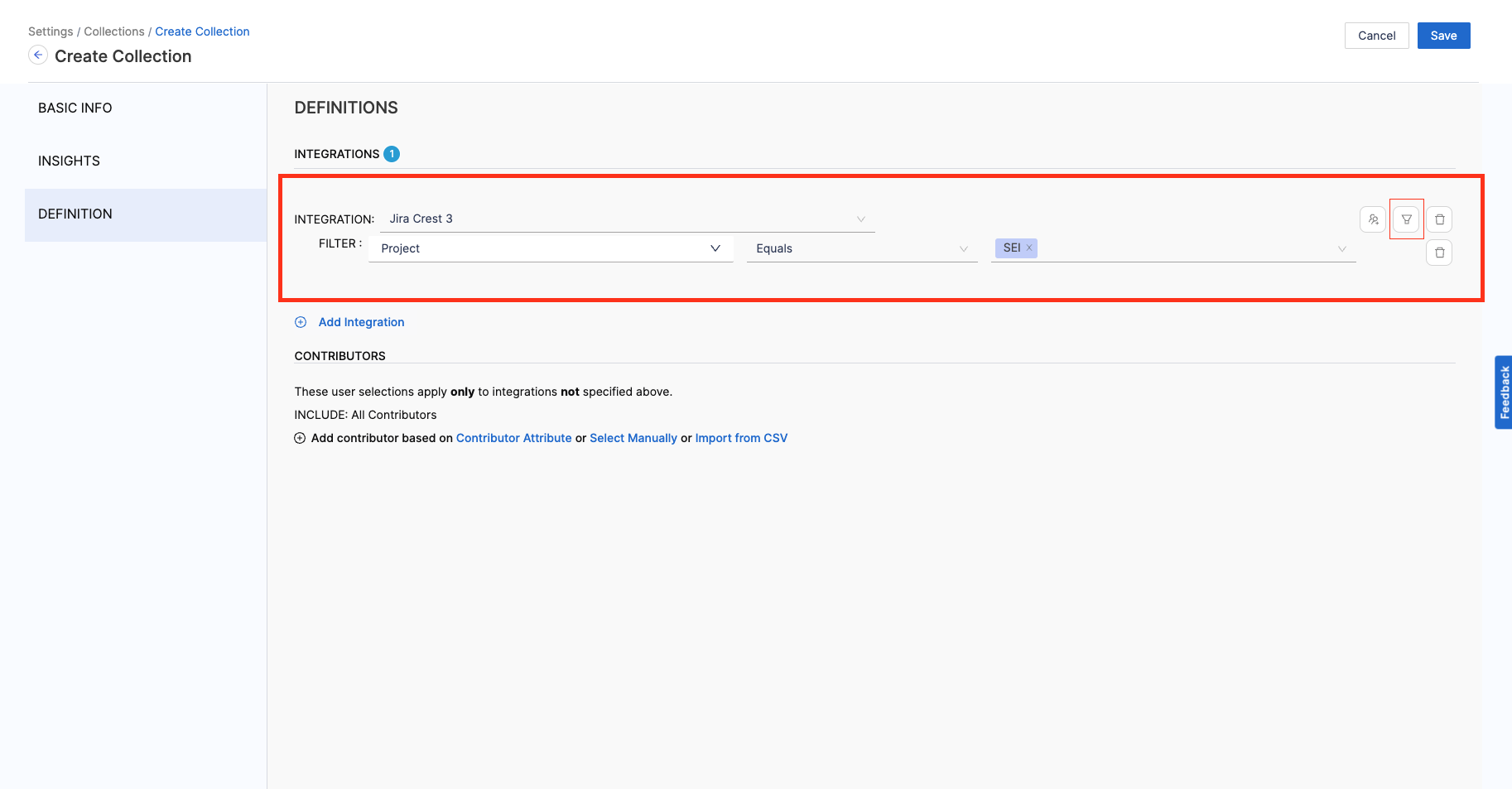 1. Add the Integration Filters to determine the criteria to associate Contributors with the Collection.