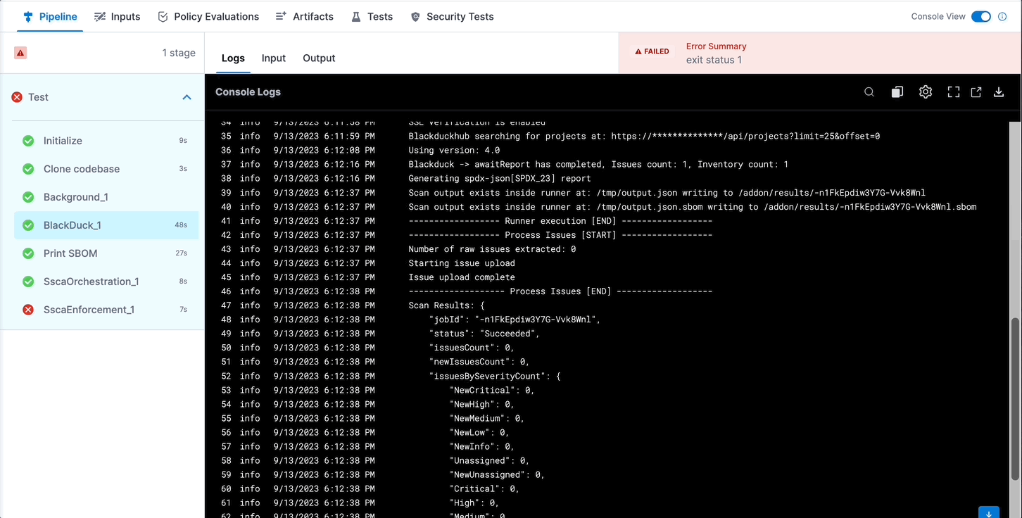 Alternately, you can get the output path and output variable expression from a previous run of the same pipeline. To do this, go to the execution details page, select the stage with the STO scanner step, and then select the STO scanner step. In the step's logs, you can find the output path, and you can get the output variable from the Output tab.