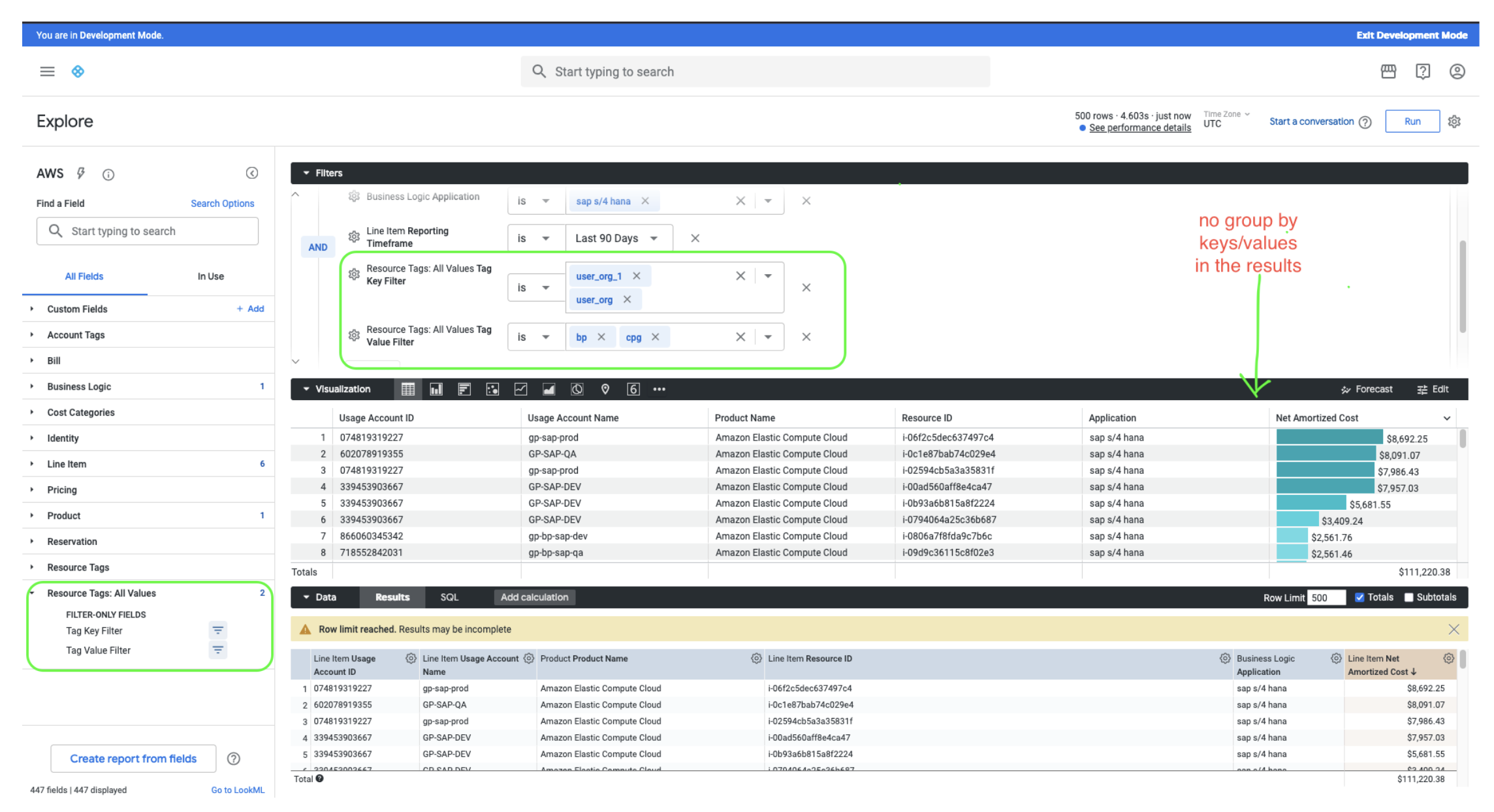 When you need to filter AWS billing data by one or multiple key/value pairs without grouping, use the new filter fields under Resource Tags: All Values.