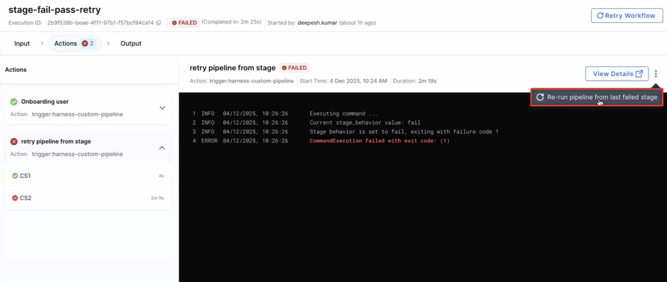 When a workflow execution fails at a specific stage in the pipeline, you can now retry the execution from the failed stage instead of starting from scratch. This saves time and resources by resuming the workflow from where it failed.