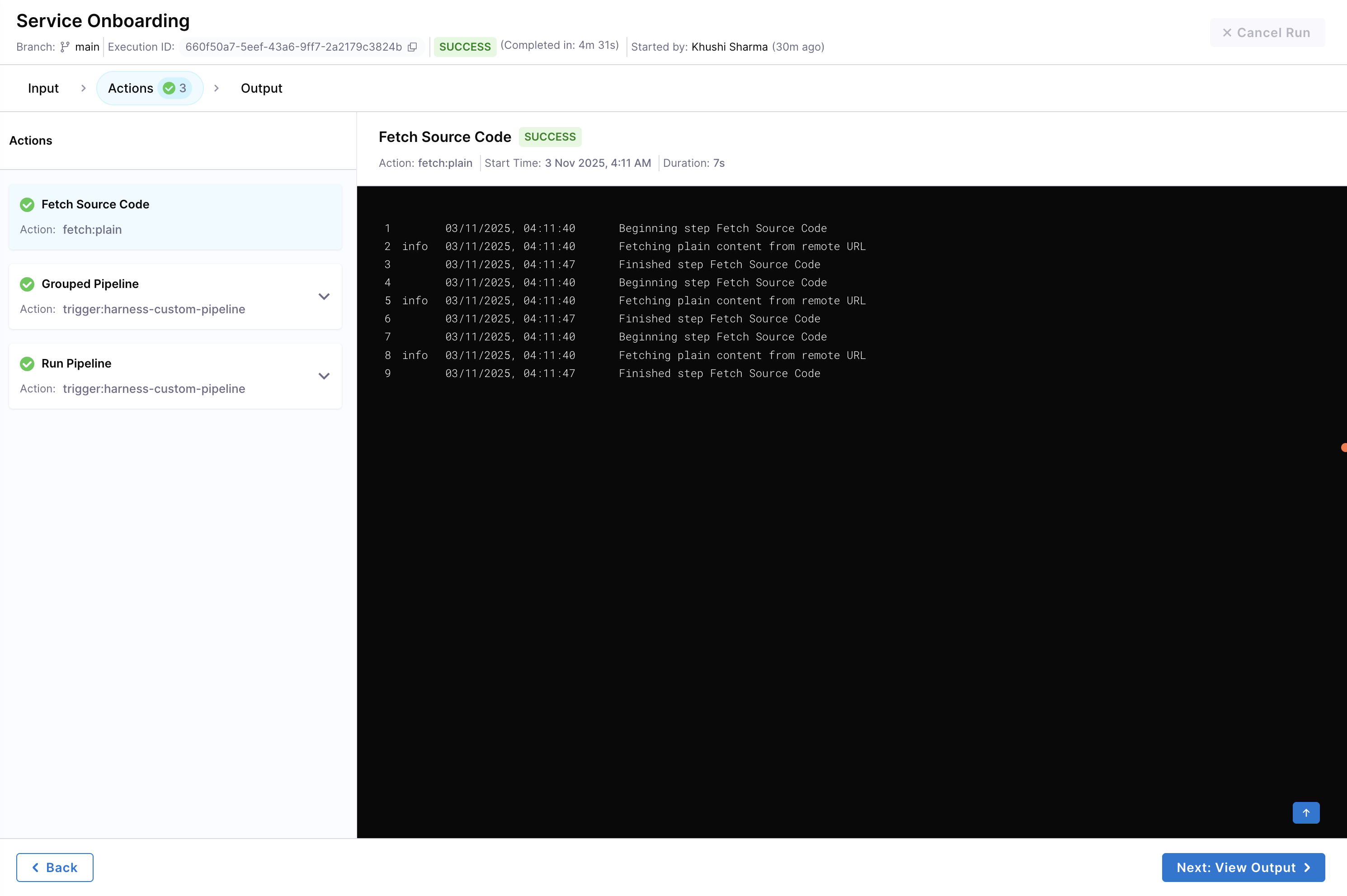 • Since the trigger:harness-custom-pipeline is now synchronous, you can use the catalog:register action in a template and register the newly generated software component's catalog-info.yaml.