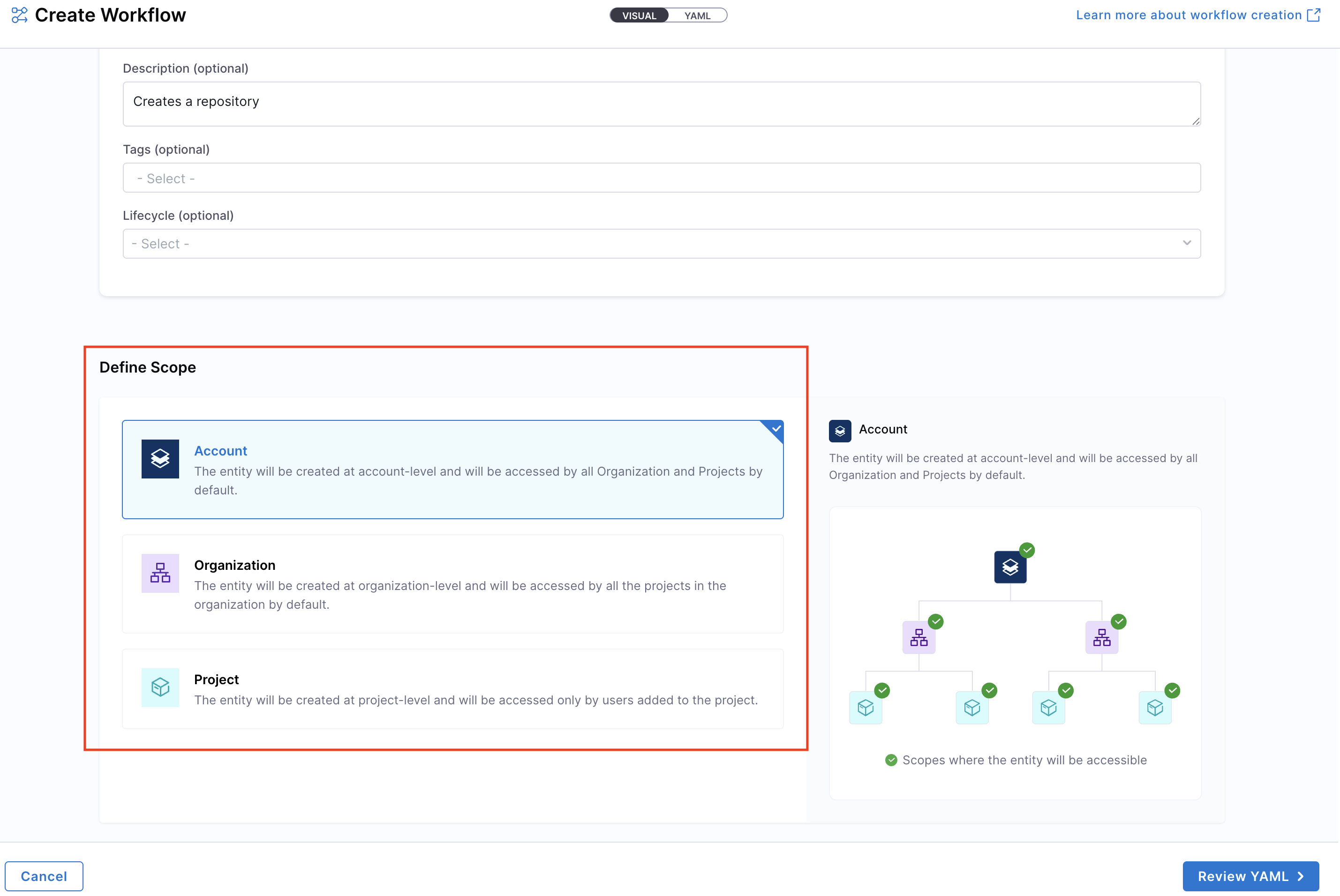When defining environment blueprints, you can now reference IaCM workspace templates and catalog entities from different scopes using scope prefixes: