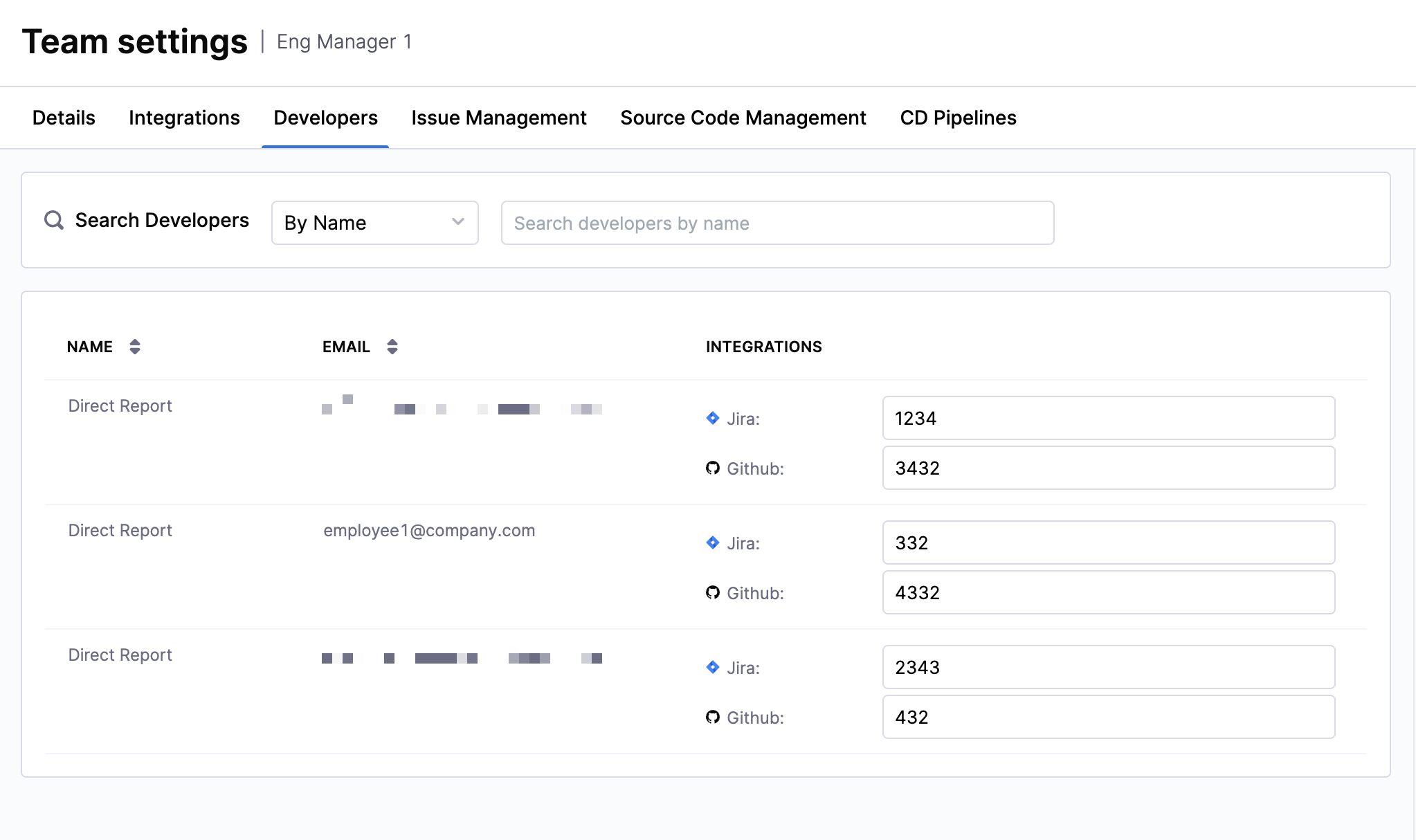 Accurate developer identity mapping is required for developer filters to work correctly. Ensure each developer has the appropriate SCM usernames and Issue Management account IDs configured.
