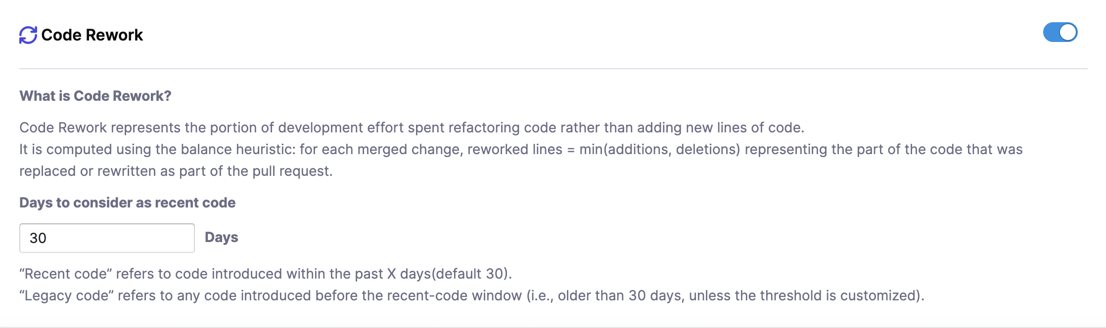 With Code Rework, you can configure how recent and legacy code is classified in a Productivity Profile, including the time window for recent code (set as 30 days, by default). This lets you analyze where rework is coming from and who is introducing it.