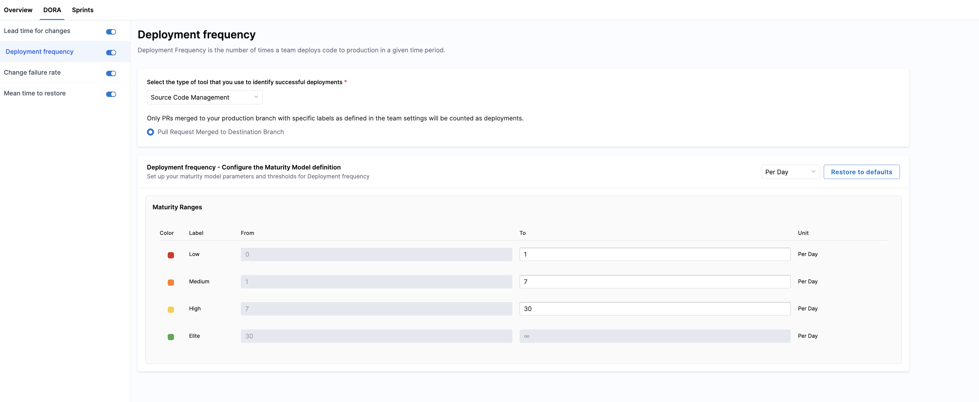 In addition, maturity thresholds for Deployment Frequency, Change Failure Rate, and Mean Time to Restore (MTTR) can be configured directly within their respective sections on the DORA tab in an Efficiency Profile.