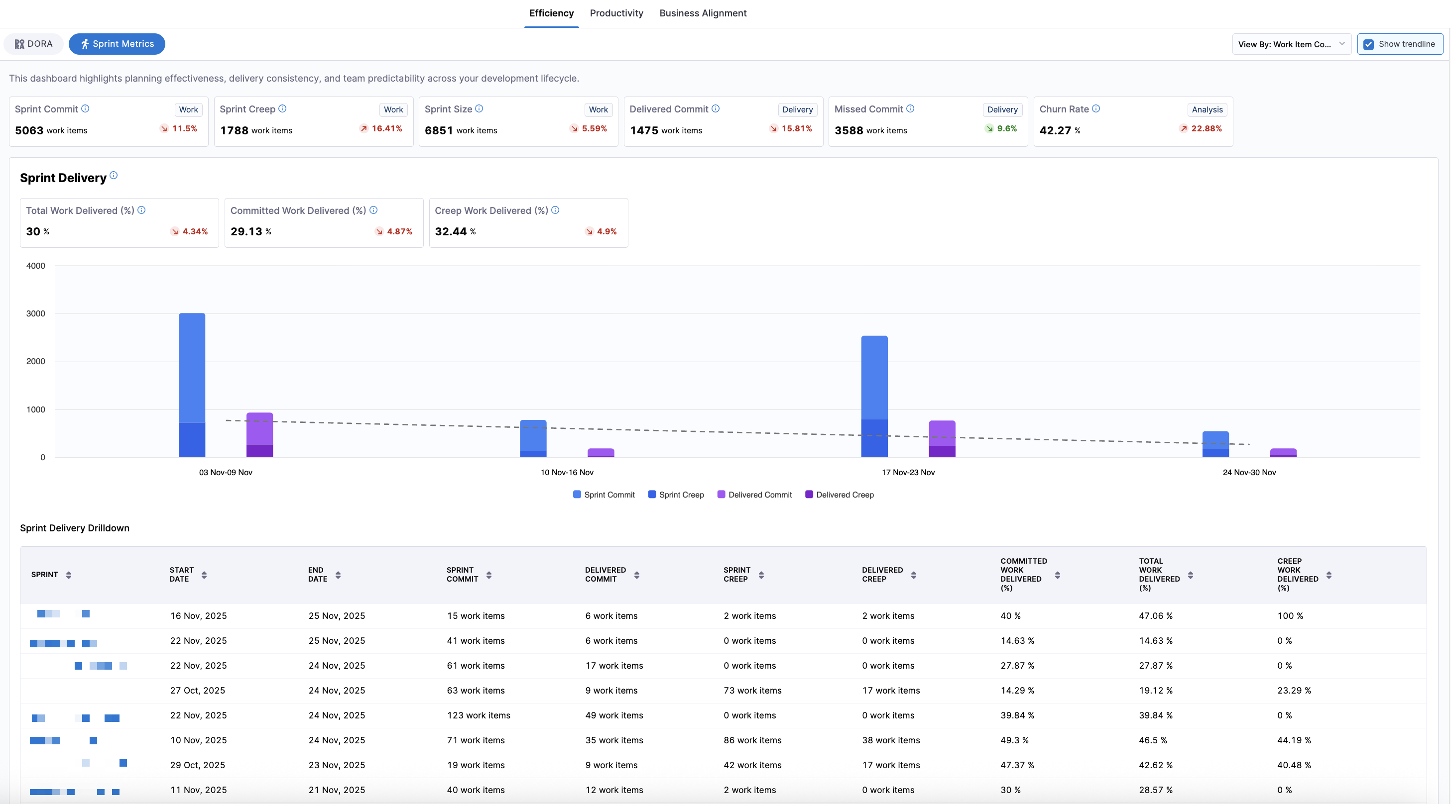 Use the Sprint Metrics dashboard on the Efficiency tab in the Insights page to analyze performance per sprint, including: